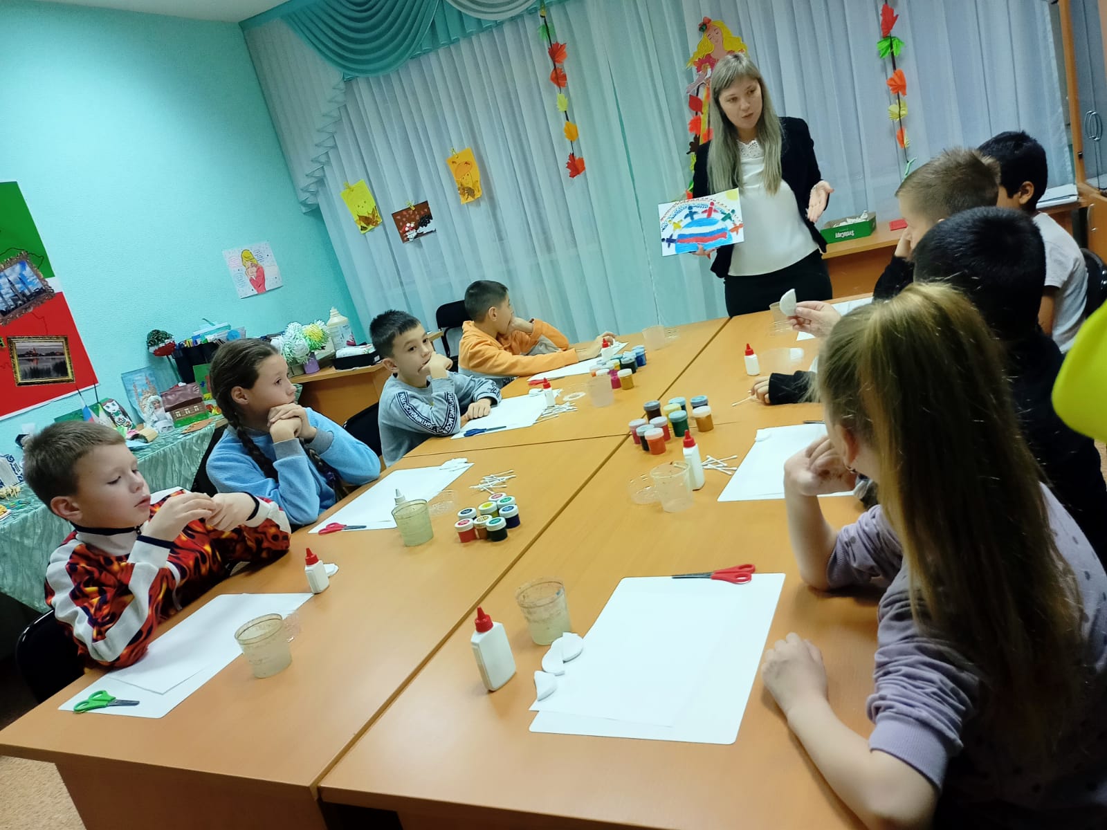 В рамках программы «Радуга красок» инструктор по труду Нижнекамского центра социальной помощи семье и детям «Веста» Ирина Кожевникова провела групповое занятие на тему: «Широка душа нашей матушки России». Занятие началось с разговора о родной стране: вместе с детьми вспомнили, как она называется, какая она по величине и т.д., порассуждали на тему, что значит родной край, родная страна, поговорили об основных символах российского государства: гербе, флаге и гимне. Ребята еще раз рассмотрели их, повторили основные цвета. Затем инструктор по труду сообщила участникам, что сегодня они будут рисовать российский флаг с помощью своих ладошек. К выполнению задания ребята отнеслись очень ответственно. На большом листе ватмана, с помощью окрашенных в разные цвета ладошек, ребята изобразили флаг РФ и приклеили фигурки мальчиков и девочек, предварительно вырезав их из бумаги. Работа получилась большой, яркой и ребятам очень понравилась! Мероприятие было проведено 8 ноября с целью воспитания любви к России, развития мелкой моторики рук, аккуратности при работе с красками, развитие любознательности, самостоятельности, работе в группе среди 3–х несовершеннолетних детей.