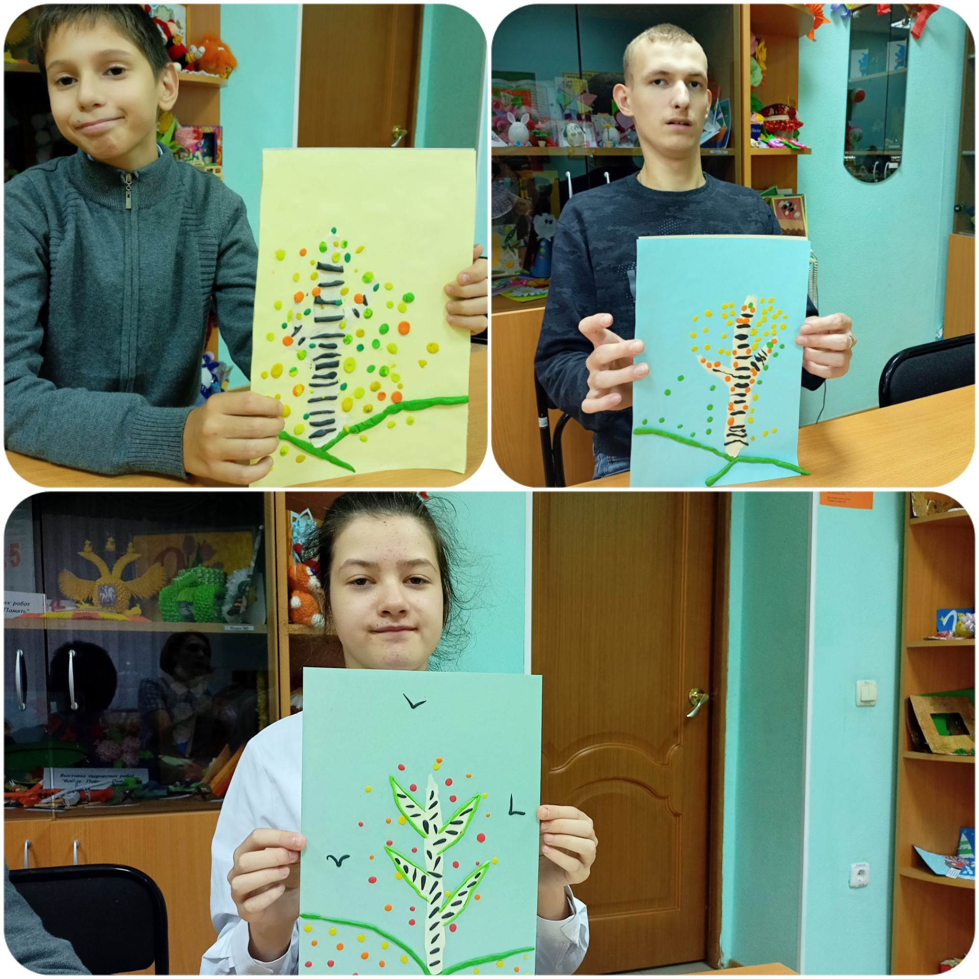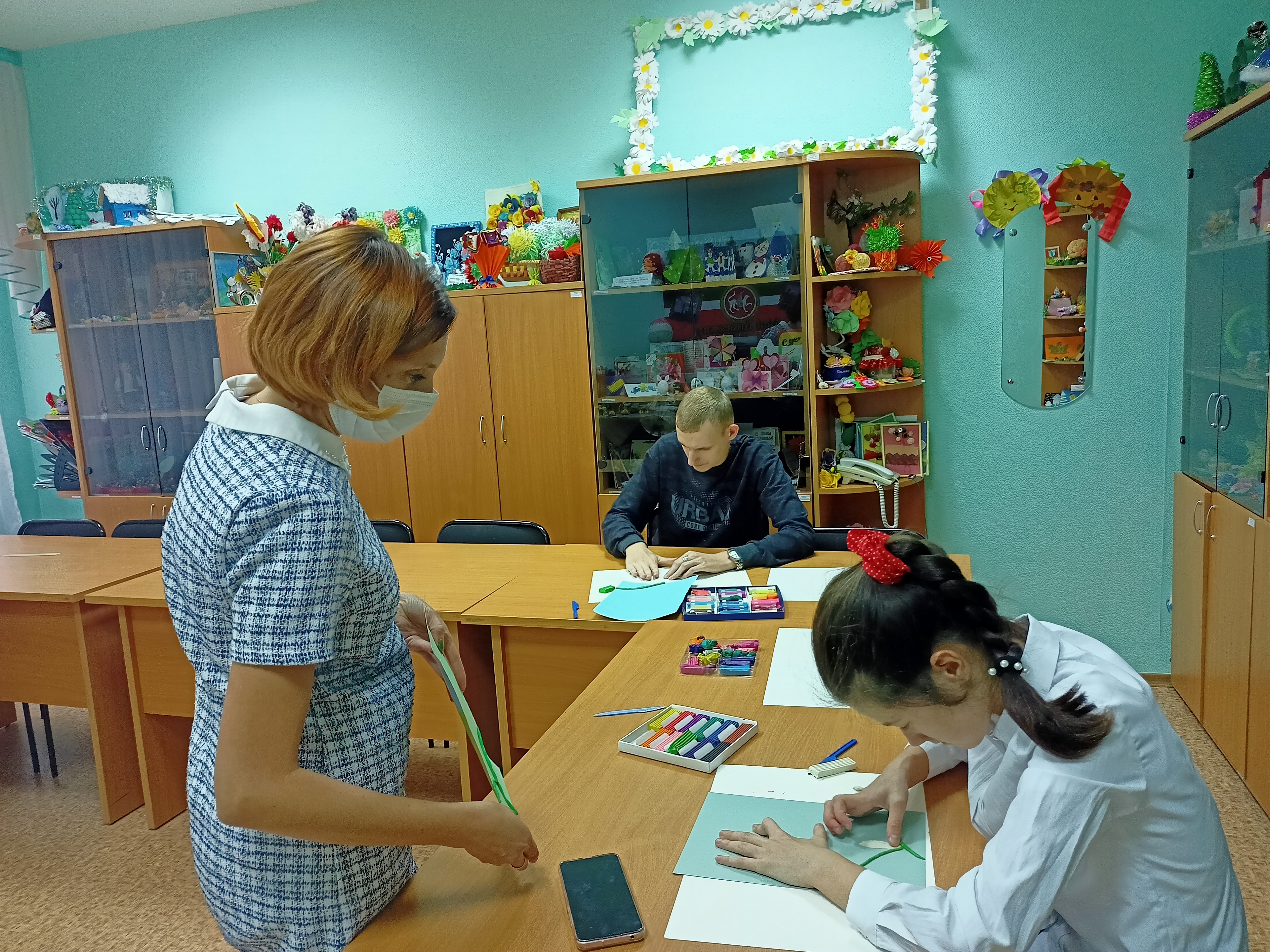 В рамках программы «Чудеса из пластилина» инструктор по труду Нижнекамского центра социальной помощи семье и детям «Веста» Ирина Кожевникова провела среди детей групповое занятие на тему: «Осень в гости к нам пришла». Занятие началось с рассказа об основных приметах осени. Ребята вспоминали отличия осени от других времен года, повторили осенние месяцы и прослушали стихотворение. После чего инструктор предложила сделать мини-картину и изобразить осеннее дерево с помощью пластилина. Узнав приемы и последовательность работы, ребята приступили к изготовлению своего дерева. Участники раскатывали пластилин, отщипывали от него кусочки, размазывали на картоне. Очень тяжело детям дался прием отщипывания маленьких кусочков, но он очень хорошо развивает мелкую моторику. В результате осенние березки получились яркие, веселые! Мероприятие было проведено 4 октября с целью развития мелкой моторики рук, внимания, воображения, творческих способностей, аккуратности и применения различных техник работы с пластилином, среди трех детей с ОВЗ.