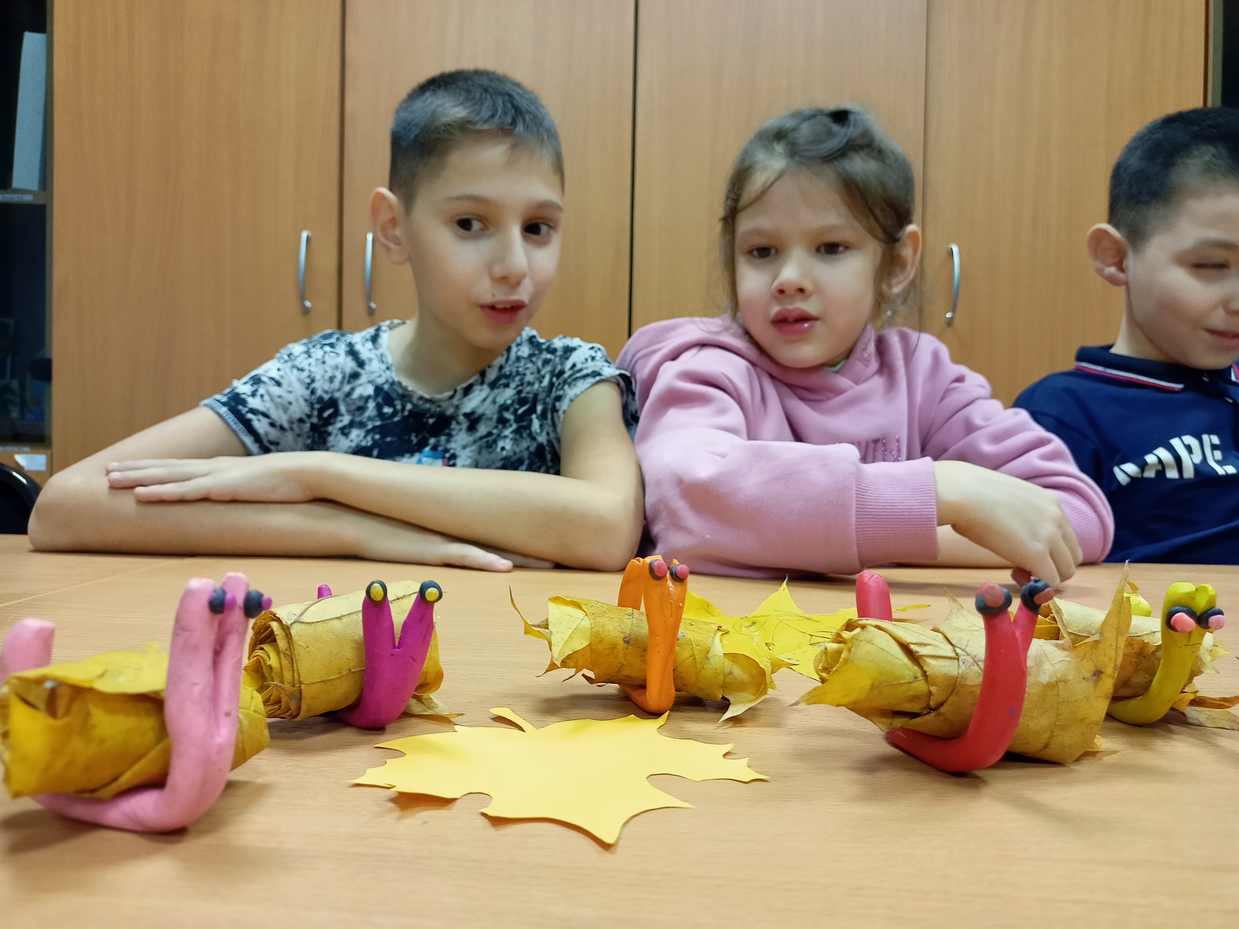Осенняя природа располагает к творчеству, ведь неожиданно из листочка, только что висевшего на дереве, может получится что - то интересное. Например, при сочетании пластилина и кленовых листьев выйдут забавные моллюски. В рамках программы «Чудеса из пластилина» инструктор по труду Нижнекамского центра социальной помощи семье и детям «Веста» Ирина Кожевникова провела групповое занятие на тему: «Осенние забавы». Мероприятие началось с разгадывания загадок на тему осени, вспомнили ее основные приметы. Далее инструктор рассказала участникам способ и очередность работы и предложила самим начать творить. Много затруднений вызвало скручивание листьев. Оказывается, это не так-то просто аккуратно и туго скрутить осенний лист. Детям очень понравилось лепить забавных зверят, а с каким интересом дети делали глаза и клешни! Поделки получились интересные, веселые и дети с удовольствием забрали их домой, чтобы показать родителям. Мероприятие, на котором присутствовали 4 несовершеннолетних ребенка, было проведено 18 октября с целью развития мелкой моторики рук, применения различных техник работы с пластилином, развития внимания, воображения, аккуратности и творческих способностей.