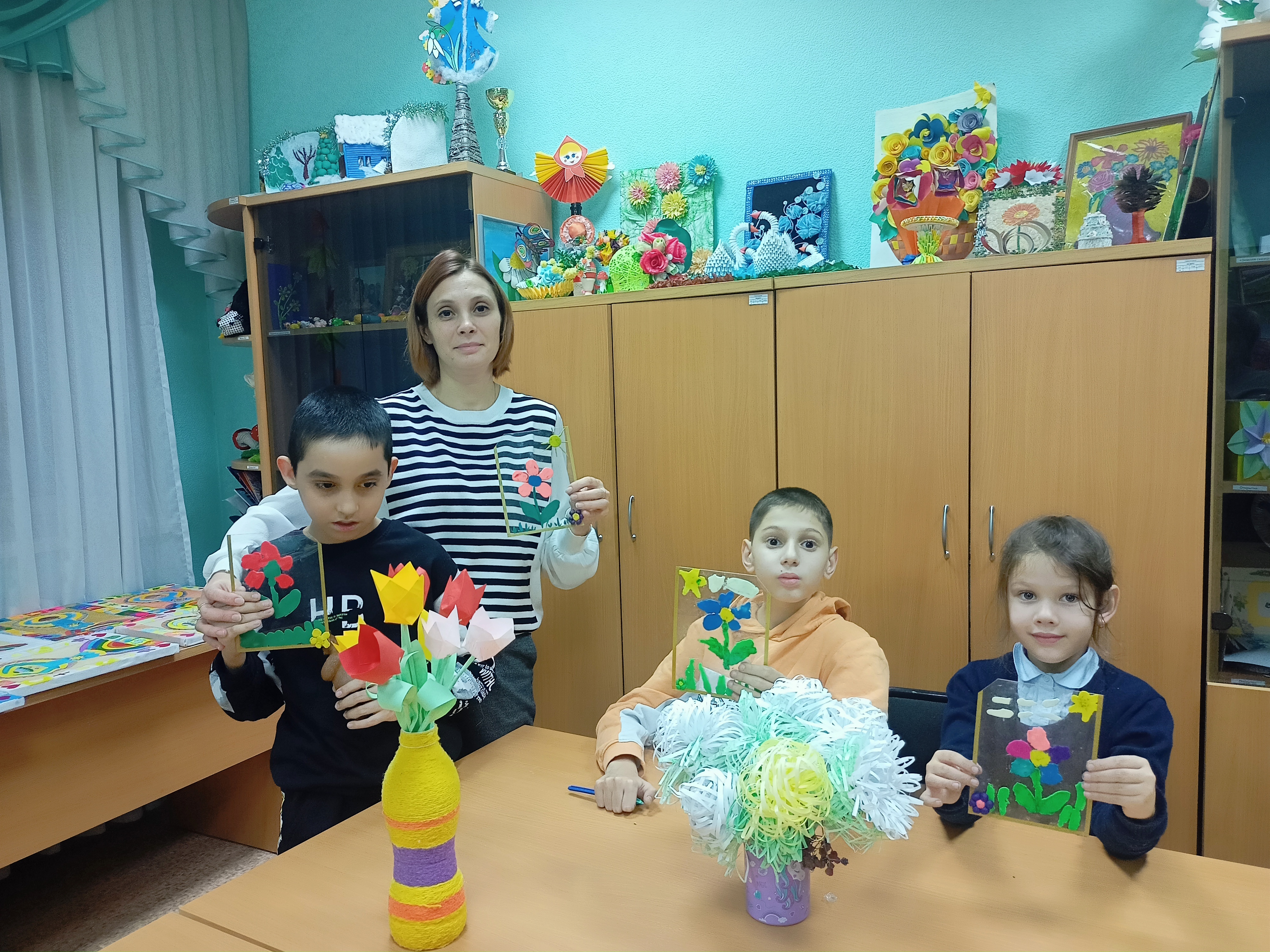 В рамках программы «Цветные ладошки» инструктором по труду Нижнекамского центра социальной помощи семье и детям «Веста» Лейсан Сунеевой было проведено групповое занятие «Букет любимой маме». Мероприятие прошло 24 ноября с целью развития мелкой моторики, воображения, аккуратности, творческих способностей, воспитания любви и уважения к матери. В начале группового занятия поговорили о предстоящем празднике Дне Матери, дети рассказали про своих мам, какие они красивые, добрые, заботливые, как они их любят. Далее ребятам было предложено в подарок любимым мамам сделать букет цветов. Инструктор по труду продемонстрировала готовый образец букета, объяснила ход и приемы работы, показала используемые техники и необходимый материал. Дети вместе с инструктором шаг за шагом делали поделку из цветной бумаги, при этом могли выбрать понравившиеся цвета. Ребята терпеливо и с любовью готовили подарки мамам, развивали воображение и творческие способности. Каждый участник добавил в свою работу всю нежность и любовь к матери, у всех получились очень красивые букеты цветов. Ребята с увлечением провели время, остались довольны готовыми работами. Присутствовали на занятии 5 несовершеннолетних детей.