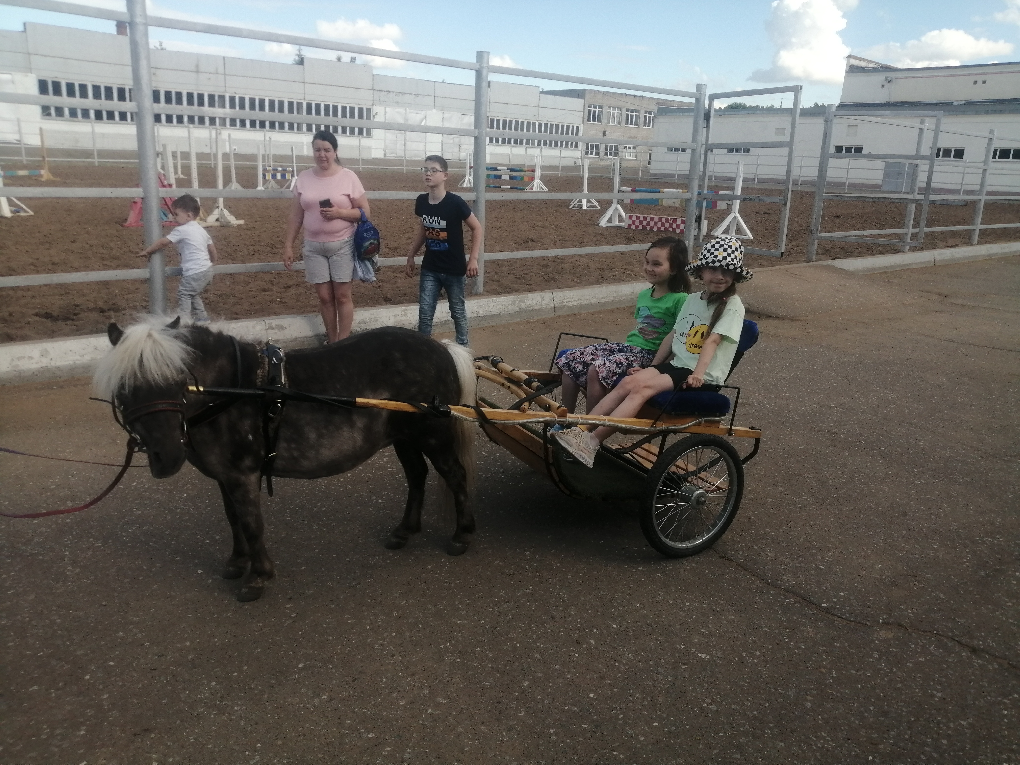 В рамках организации летнего досуга семей с детьми, состоящих на социальном обслуживании, социальный педагог Олеся Мингазетдинова организовала экскурсию в конно - спортивную школу «Актай». В начале экскурсии тренер конно - спортивной школы рассказала участникам много интересного о лошадях: про породы, масти, об уходе и правильном кормлении, о выборе кличек. Особенно про иппотерапию, которую применяют при лечение различных заболеваний. Также детям разрешили покормить животных морковкой, яблоками и сахаром. В конце экскурсии детей прокатили на тележке – качалке, в которую была запряжена пони по имени Милка. Радости ребят не было предела. Родители и дети поблагодарили сотрудников конно – спортивной школы за интересную экскурсию и пожелали вновь сюда вернуться. Целью мероприятия явилось формирование гуманного отношения к животным и расширение кругозора детей, а также создание эмоционально положительной атмосферы. На экскурсии присутствовало несовершеннолетние дети из 20 семей, в том числе дети с ОВЗ.
