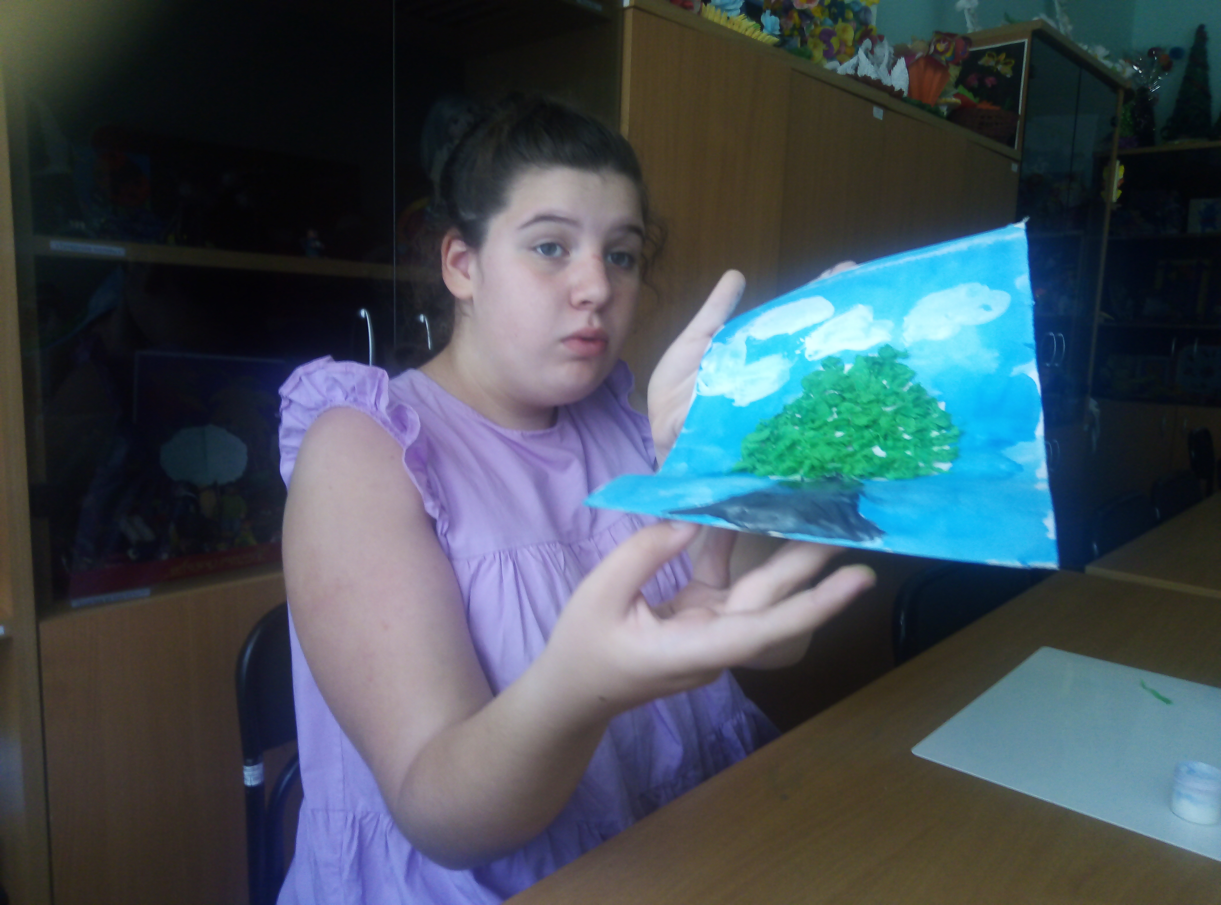 В рамках программы «Мир творчества» 26 августа инструктор по труду Нижнекамского центра «Веста» Елена Вагурова провела индивидуальное занятие «Природный мир-Татарстана». Цель: закрепить знания о природе и её окружении, научить передавать в рисунках особенности природы, умения рисовать кистью, создание композиции рваной аппликации из гофрированной бумаги. В начале занятия был показан образец готового тематического рисунка и объяснены ход и приемы работы. Для рисования природы был использован метод рисования гуашью. Аппликация и художественное конструирование с использованием гофрированной бумаги могут быть: предметными, сюжетными, и декоративными. В процессе работы ребёнок познакомился с разными приёмами обработки гофрированной бумаги: обрыванием, сминанием, скручиванием, наклеиванием, вдавливанием и др. Данная техника помогает в развитии детского творчества: эстетического вкуса и художественного воображения; развивают тактильные ощущения и моторику; помогают в изучении цветов и форм; ребёнок узнает на практике слово « технология » – ведь чтобы получить результат нужно сначала потрудиться и сделать определенные действия.