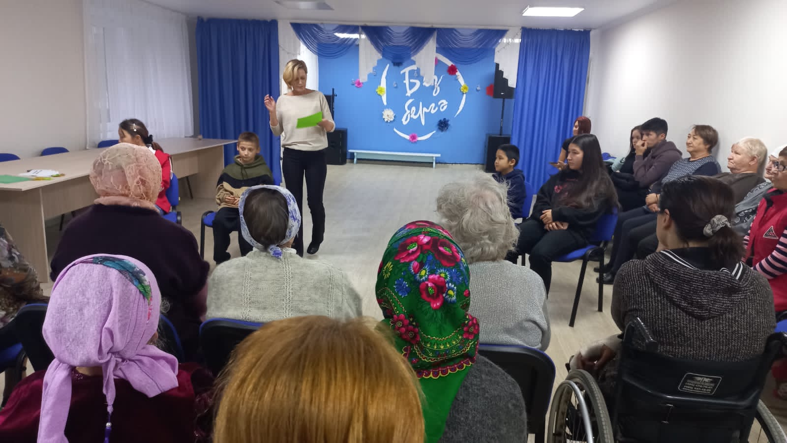 Групповое занятие на тему: «День пожилого человека» провела среди детей, подростков и лиц пожилого возраста специалист по социальной работе Нижнекамского центра социальной помощи семье и детям «Веста» Людмила Касаткина. Мероприятие проведено с целью привлечения внимания к проблемам пожилых граждан и воспитания к ним уважительного отношения. В начале мероприятия специалист с участниками обсудили проведение Дня пожилого человека в России и его значимости. Ребята рассказали о своих бабушках и дедушках, об ярких и приятных впечатлениях в общении с ними. Затем участники приняли участие в игре «Чем занимается бабушка?», рассмотрели возможность социальной активности пожилых граждан от спортивных площадок до творческих студий. Мероприятие продолжилось соревнованием в отгадывании любимых сказок и загадок «Кто быстрее», которое позволило еще больше сплотить взрослых и детей. На занятии, которое было проведено в специальном доме для одиноких престарелых граждан, присутствовали 12 несовершеннолетних детей и 8 лиц пожилого возраста.