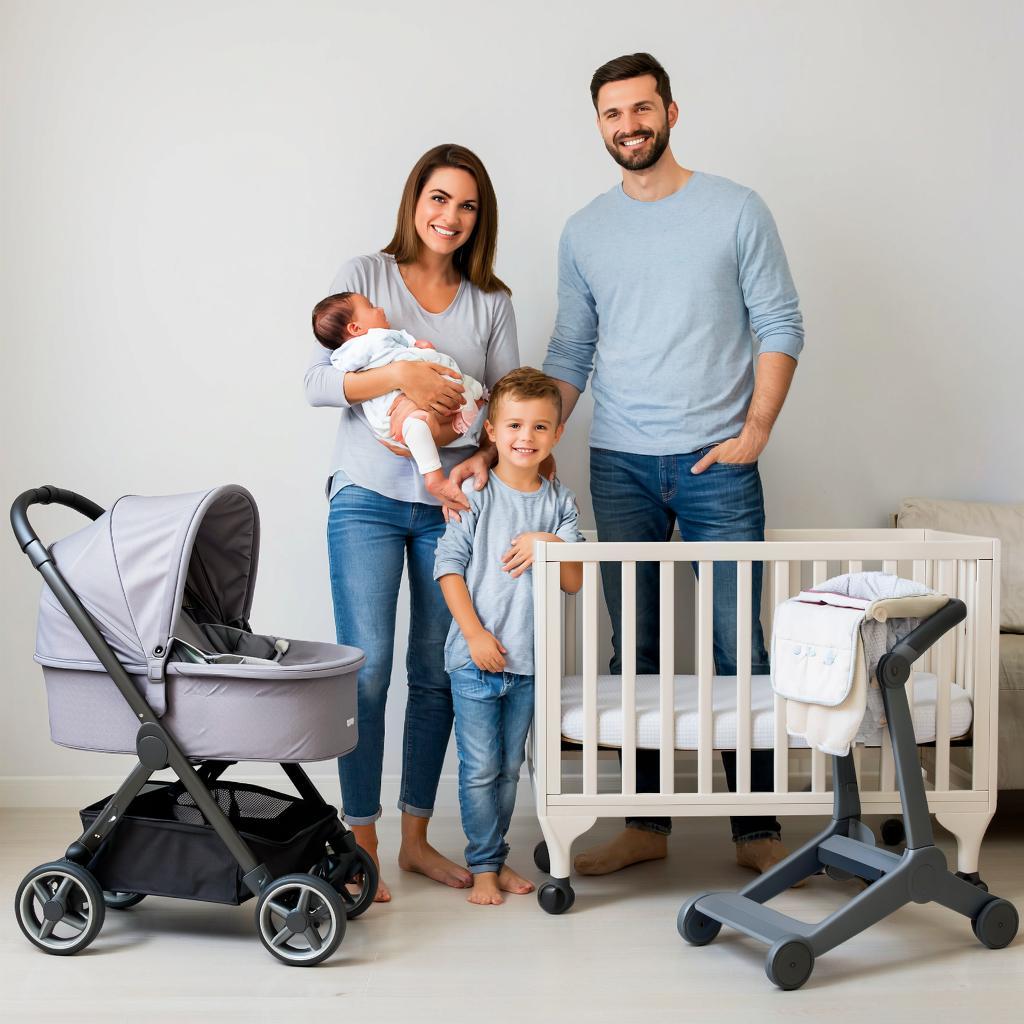 Перечень необходимых предметов включает трансформер-коляску, детскую кровать, ходунки, cfyrb, пеленальный стол и стул для приема пищи ребенком. Большинство указанных изделий ориентированы на малышей младше полутора лет.