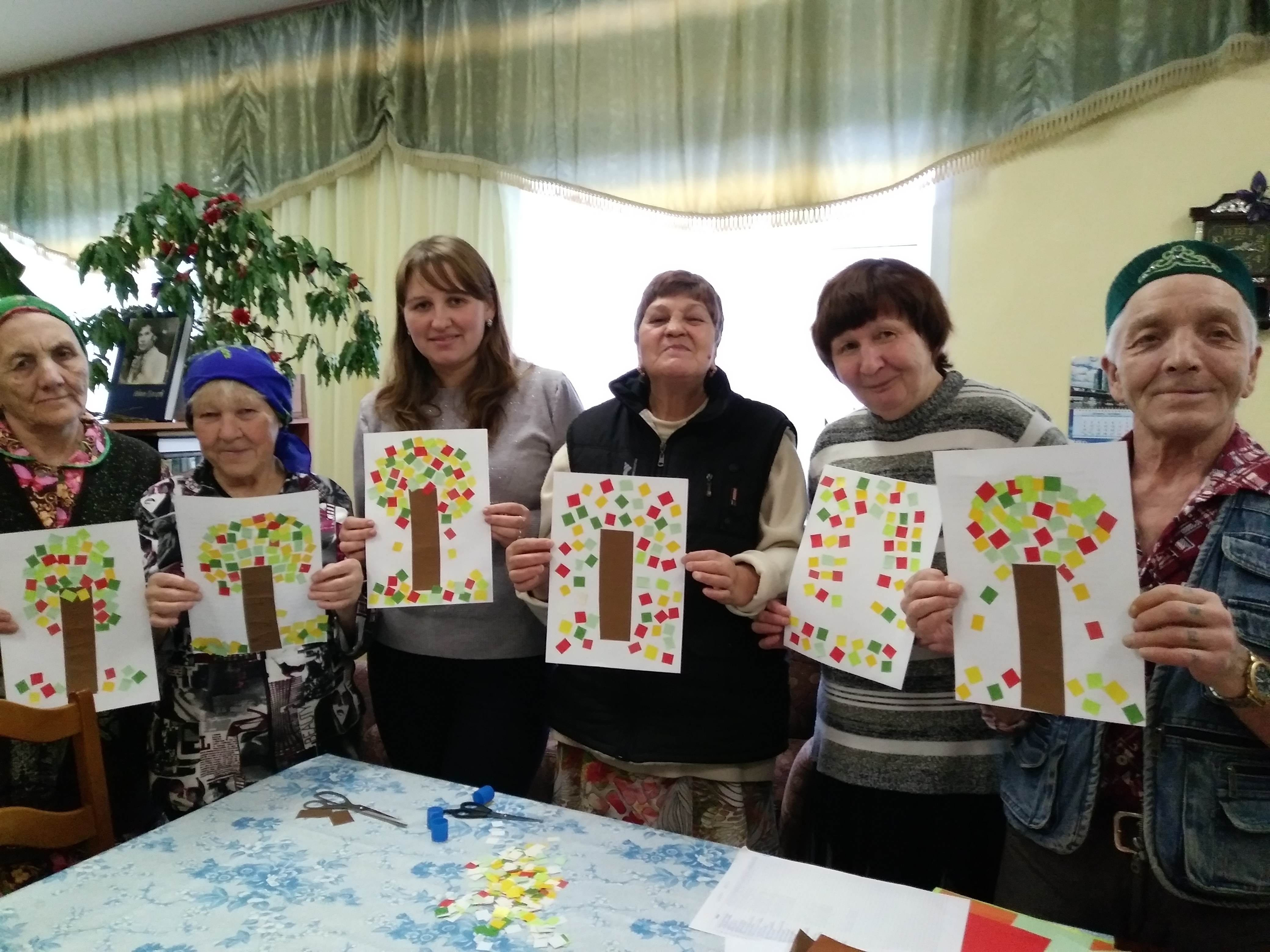 Очередное занятие по технологии «Бумагопластика» прошло в Джалильском доме – интернате для престарелых и инвалидов. Воспитатель Минабутдинова О.С. познакомила жителей с новой техникой – «обрывная аппликация».