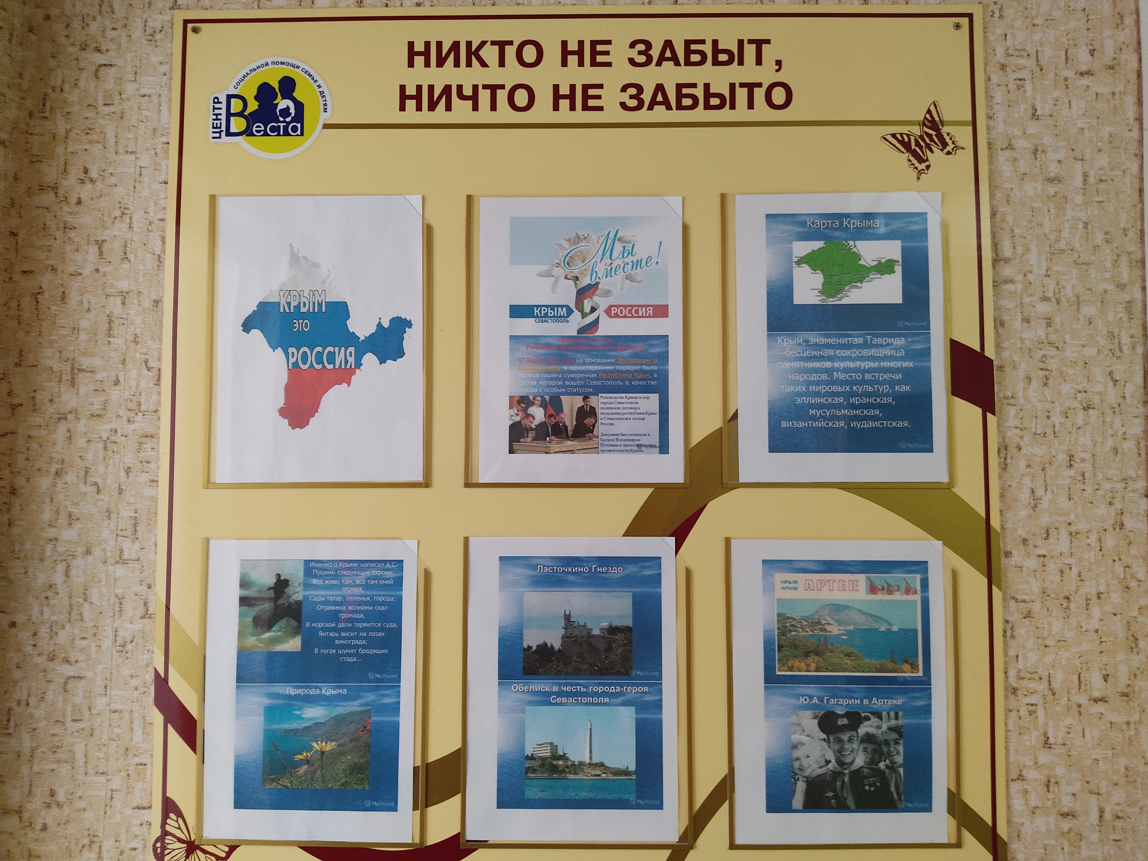 В честь исторического события – Дня воссоединения Крыма с Россией социальный педагог Елена Макарова оформила в центре тематический стенд «Крым – это Россия». Из материала, размещённого на стенде,посетители узнают историю возникновения полуострова Крым, его географическом положении, природе, климате, населении, экономике, достопримечательностях. И самое главное, что 18 марта 2014 года произошло важное историческое событие – присоединение Крыма к России, т.е. вхождение в состав РФ.