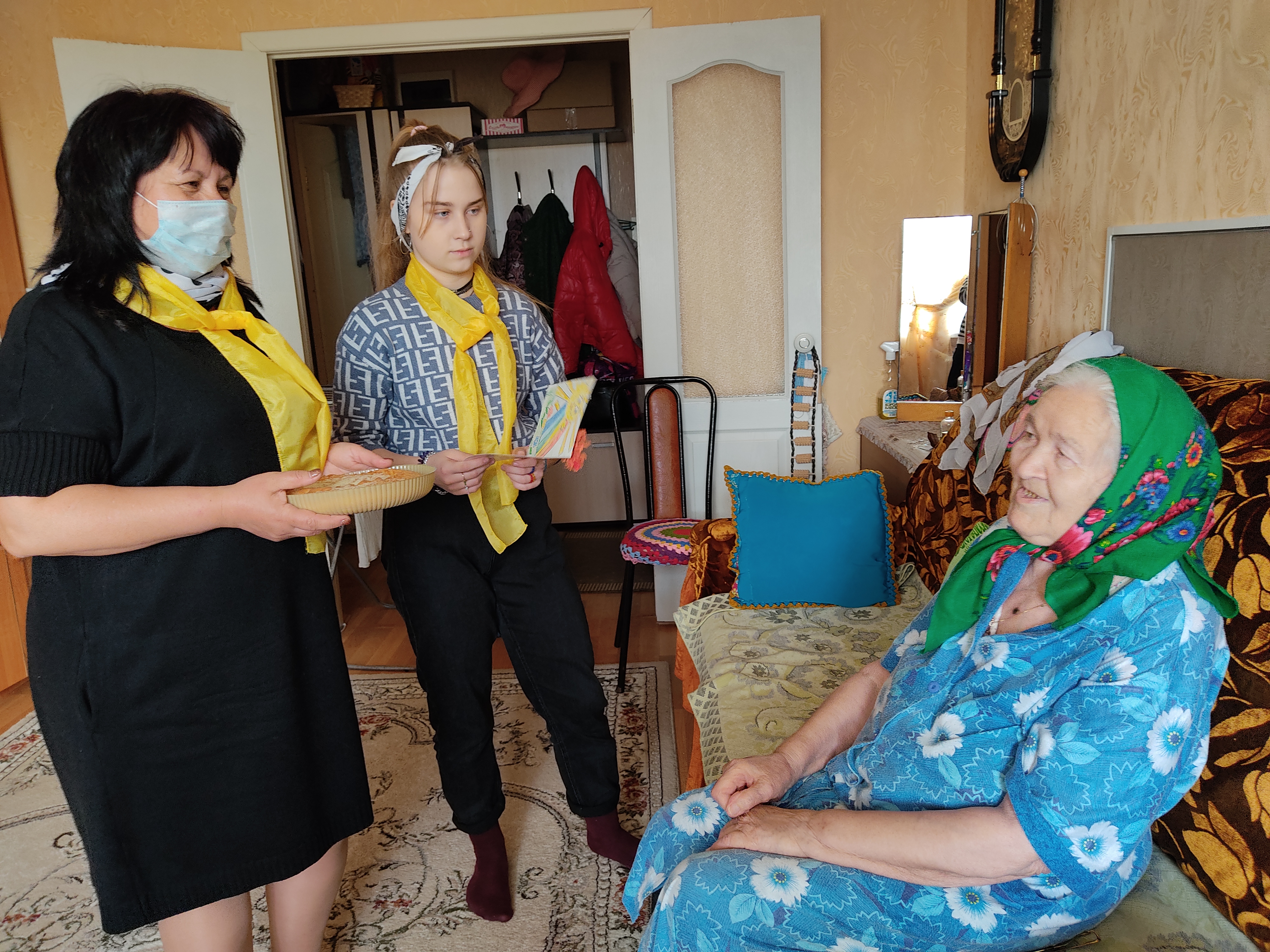 В преддверии празднования Дня Победы в рамках социально-гуманитарного проекта «У войны не женское лицо…» специалист по социальной работе Альфира Юнусова совместно с двумя волонтёрами отряда «Поколение добра» провели акцию «Мы Вас помним». С поздравлениями, со сладкими подарками и открыткой, сделанной своими руками, волонтеры навестили труженицу тыла Ярцеву Анну Яковлевну. Ребята от всего сердца поздравили ее с наступающим праздником 9 Мая, прочитали ей стихи, спели песни. В свою очередь труженица тыла рассказала гостям о тяжелых годах войны, поблагодарила за проявленное внимание и теплые поздравления. Волонтеры пожелали Анне Яковлевне крепкого здоровья, долгих лет жизни, оптимизма, благополучия и мирного неба. Участие детей в данной акции подтверждает, что подрастающее поколение не утратило чувство благодарности к ветеранам, подарившим нашему народу мирную и счастливую жизнь. Целью мероприятия явилось воспитание подрастающего поколения в духе патриотизма, гражданственности, гордости за свой народ и благодарности к ветеранам, укреплению связи между поколениями.