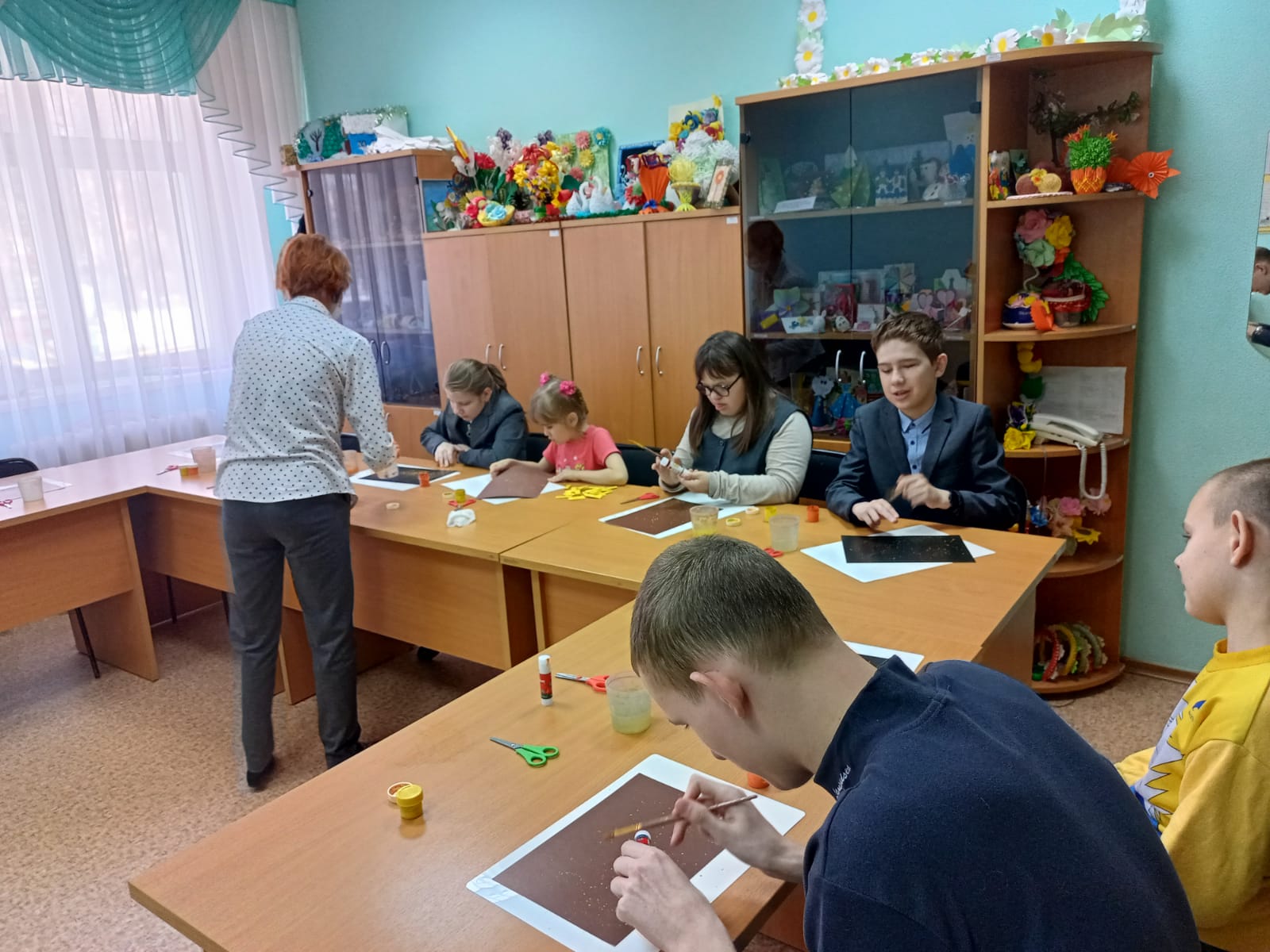 В рамках празднования Дня космонавтики 13 апреля инструктор по труду Ирина Кожевникова провела групповое занятие на тему: «Дорога в космос» из программы «Мир творчества» Мероприятие было проведено с целью развития воображения, фантазии и творческих способностей, а также аккуратности и умения работать с шаблонами. Присутствовали на занятии 7 несовершеннолетних детей. В начале занятия инструктор поговорила с участниками об истории развития космонавтики: кто был первым космонавтом, название ракеты, на которой полетел первый человек в космос, понятия «космос», «ракета», «планета». Не обошлось и без загадок про космос. На листе картона, представляющем из себя космическое пространство, ребятам предстояло зажечь звезды, разместить планеты, между которыми будут летать космические корабли, летающие тарелки или ракеты. Варианты сюжета зависели от фантазии и замысла ребенка. Сначала участники занятия подготовили фон – зажгли мелкие звезды при помощи гуаши. После чего подготовили разноцветные детали с использованием шаблонов. Инструктор объяснила и показала, как детали накладывают одну на другую и скрепляют клеем, чтобы получился цельный фрагмент. В конце занятия дети рассмотрели и проанализировали свои работы, обменялись впечатлениями.