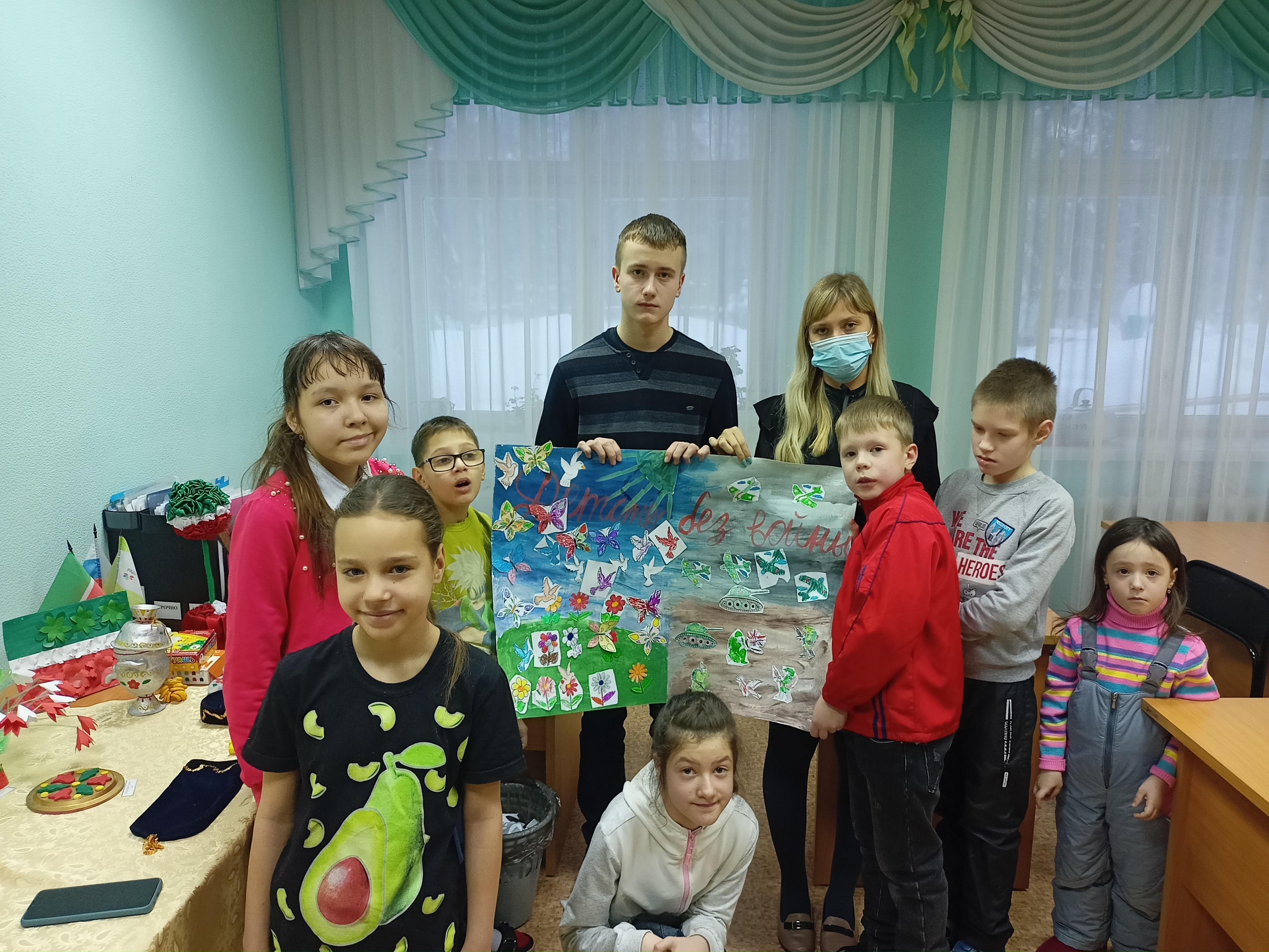 В рамках героико-патриотического месячника инструктором по труду Лейсан Сунеевой было проведено групповое занятие по изготовлению коллажа «Детство без войны». Мероприятие было проведено 11 февраля с целью патриотического воспитания несовершеннолетних, развития творческих способностей. Присутствовали на занятии 10 несовершеннолетних детей. В начале занятия была проведена беседа о том, что такое «война» и «мир». Ребята поделились тем, что война – это очень плохо, потому что гибнут люди. Поэтому нужно жить в мире и согласии. Далее специалист предложила участникам сделать коллаж «Детство без войны». Сначала обсудили, что ребята подразумевают под понятием мир, что из себя будет представлять коллаж, из каких деталей состоять. Определили вид и формат самого коллажа, выбрали необходимые материалы и инструменты. Каждый ребенок участвовал, как в выполнении общей работы над коллажем, так и в изготовлении отдельных элементов (цветов, бабочек, голубей, танков, самолетов, солдат). В процессе работы участники проявили свои творческие способности, фантазию, развили мелкую моторику и аккуратность. Также, благодаря данной работе, участник научились взаимодействовать в коллективе, слушать и слышать друг друга, поддерживать и отстаивать свое мнение.