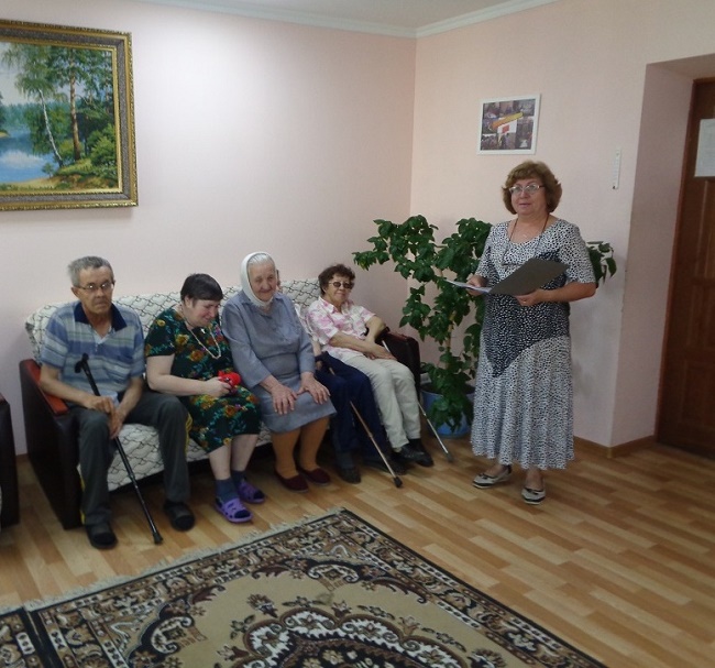 24.06.19г в «Спасском доме - интернате для престарелых и инвалидов», в рамках реализуемой программы «Помоги себе сам», с целью развития позитивного принятия старости, психологом Родиковой Л.В. проведено занятие с элементами тренинга «Привычки счастливого человека». Пожилые люди рассмотрели психологические особенности реагирования на собственное старение, отношение к личным потерям, утрате прошлых возможностей, иное восприятие к окружающем. Психолог познакомила с противоположными реакциями отношения к типичным ситуациям, которые помогают чувствовать себя в гармонии с окружающим миром, а значит быть более счастливым. Участники занятия получили настрой на использование правил поведения счастливого человека таких как: восприятие ценности жизни, оптимизм, безусловная любовь к близким, умение прощать и благодарить, забота о себе, творческое решение проблем, инициативность, честность, юмор, смех и др. Получателям социальных услуг понравилось обучение приемам медитации и релаксации.