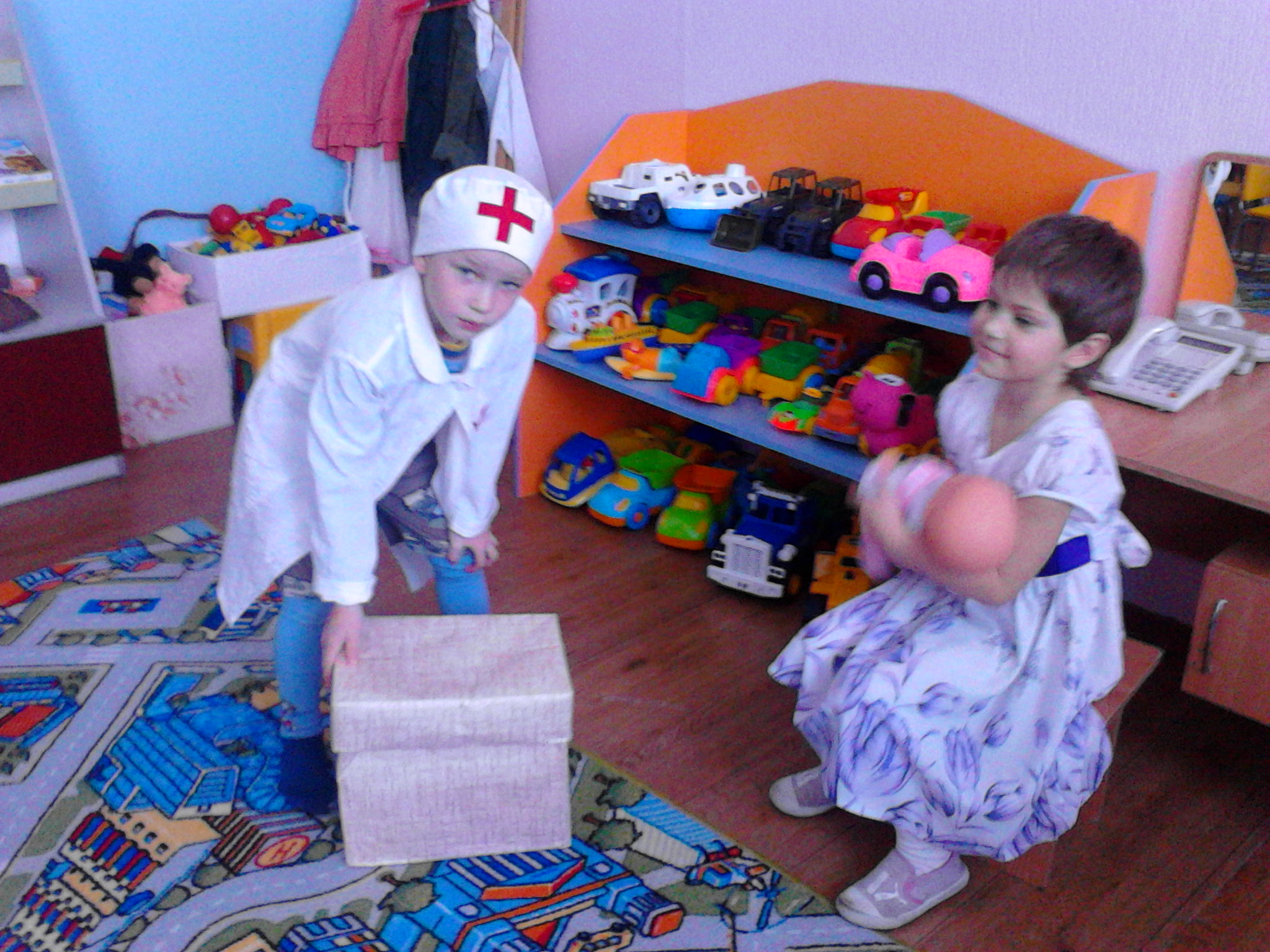 Дети, а если кто – то из членов вашей семьи заболел, что вы будете делать? (Обобщаю ответы детей).Далее воспитатель предложила детям сюжет игры: заболела кукла Маша, она капризничает у нее болит горлышко. Дети чтобы не огорчать куклу Машу, давайте мы станем ее семьей и позаботимся о ней. Что нужно сделать ,вызвать доктора. Доктор приехал и вылечил куклу Машу. Были ли у вас такие случаи дома? Что делали врачи «Скорой помощи»? Детям игра очень понравилась, они играли очень дружно .