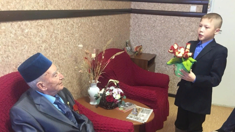 Хәтта кече сыйныф укучылары да читтә калмады: хор белән җырладылар һәм ветеранга чәчәкләр, бүләкләр тапшырдылар.