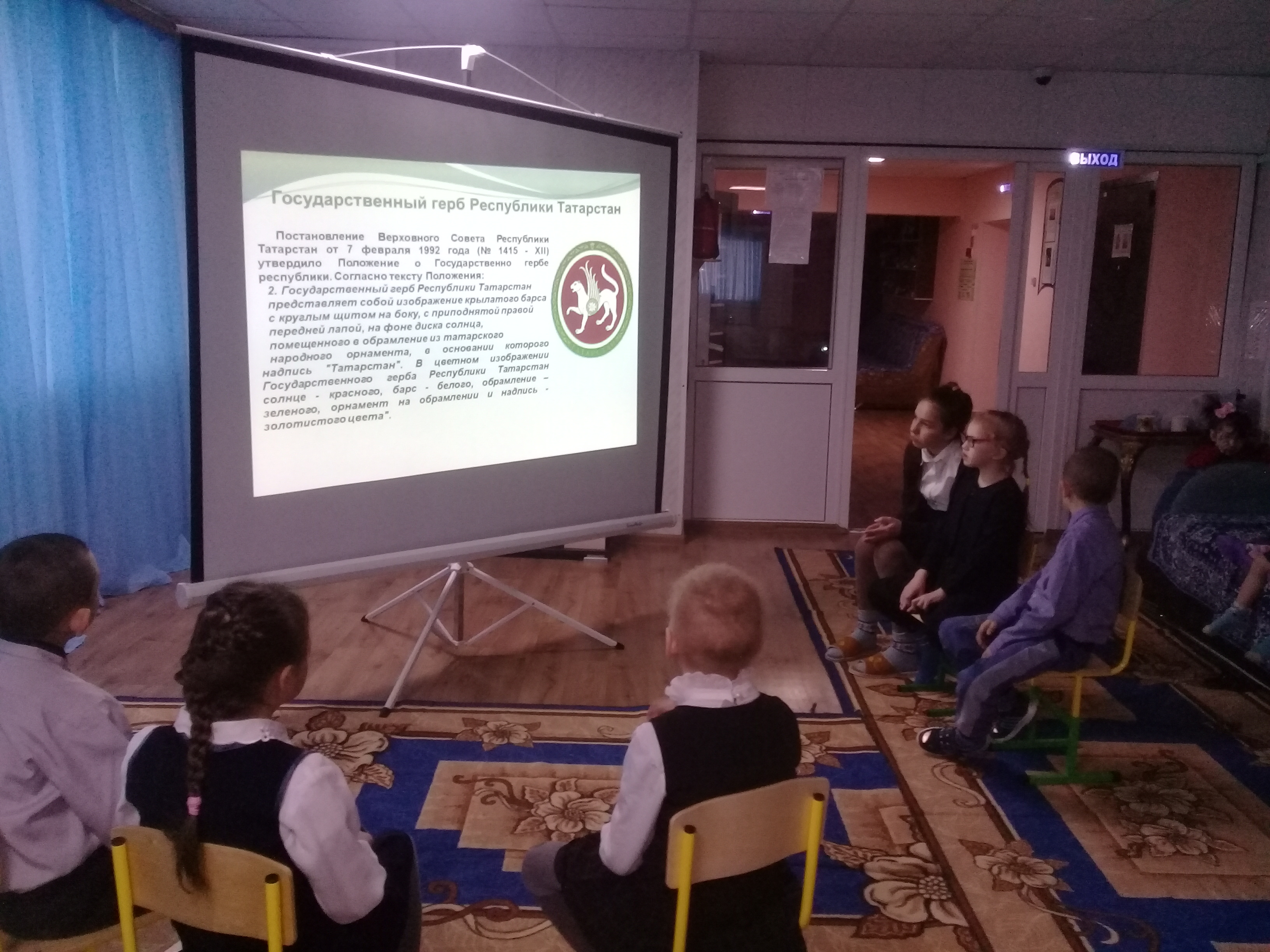 Аксубай Муниципаль районының “Хыял” балалар һәм яшьүсмерләр приюты”нда тәрбияләнүчеләр белән Татарстан гербы һәм әләменең килеп чыгышы турында призентацияләнгән әңгәмә үткәрелде. Әлеге чараның максаты булып үсеп килүче буында үз Республикасына карата патриотлык хисләре тәрбияләү, Дәүләтебез символикаларын танып белү тора. Чараны тәрбияләнүчеләр Татарстан Гимнын җырлап тәмамладылар.