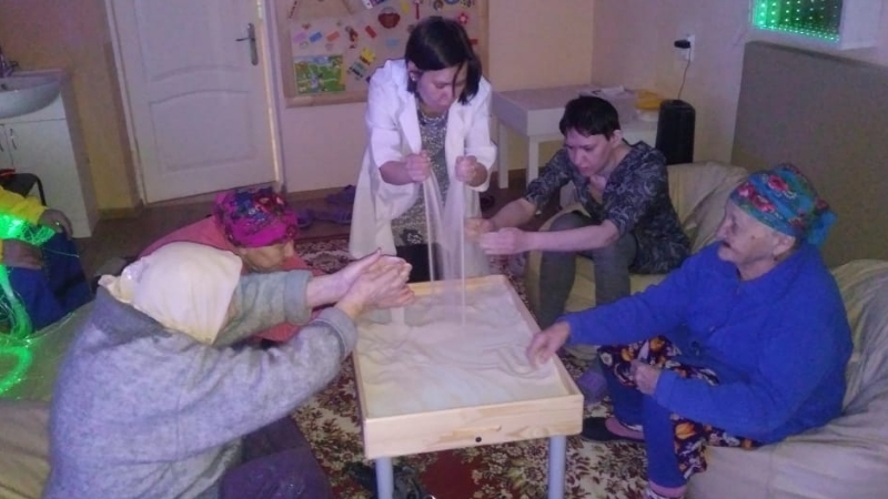 Арт-терапиянең иң нәтиҗәле ысулларының берсе ком терапиясе - ком белән рәсем ясау. Картлар ихтыяҗларына нигезләнеп, психолог Нәҗметдинова Г. М. ком терапиясе курсын эшлэде, ул чара рәвешендә үткәрелә. Чаралар саны күп факторларга бәйле, мәсәлән, картларның танып-белү процессларының торышына һәм реабилитацияләү фаразына бәйле. Чаралар психолог бүлмәсендә үткәрелә, һәм озынлыгы 40-45 мин. Шул тәртиптә дәресләрдә катнашучылар бер-берсе белән дуслаша һәм башка тернәкләндерү чараларын вакытында үтәргә өлгерәләр. Чаралар атна саен үткәрелә. Чарада катнашучыларның саны-6 кешедән тора; бу һәр кешегә үзен күрсәтергә мөмкинлек бирә. Чарага түбәндәге күнегүләр керә: