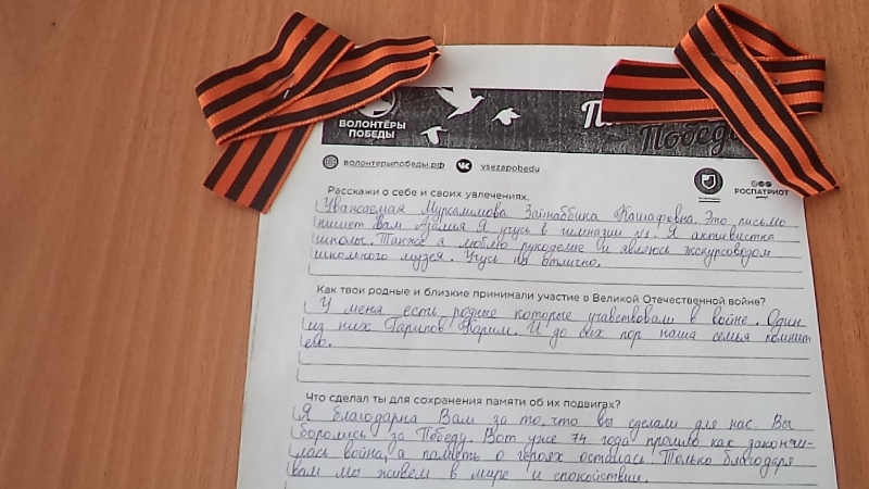 Балаларның хатларында батырлар буынына соклану һәм җиңү өчен олы рәхмәт сүзләре язылган. Волонтерлар үзләре ветераннарга өч почмаклы хатлар юллады. Язылган хатларны "Доверие - Ышаныч" үзәгенең өйдә социаль хезмәт күрсәтү бүлегендә эшләүчеләр тәгаенләнгән адресатларына тапшырачак.