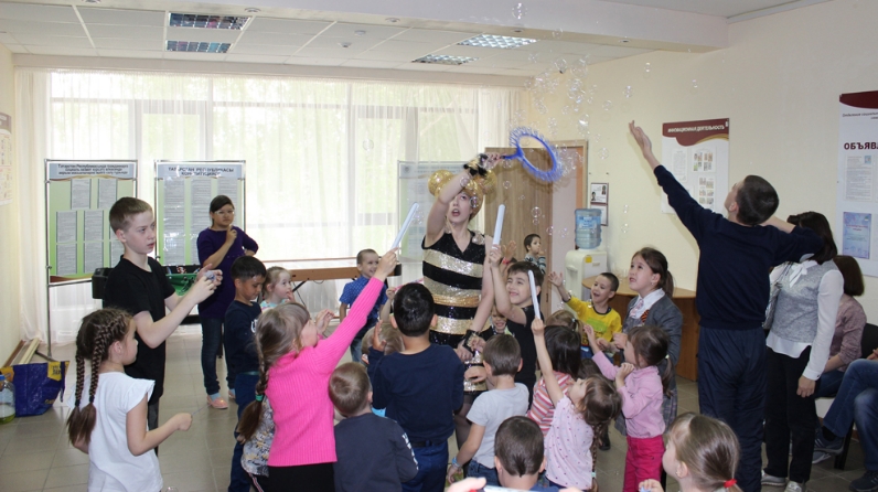 Программа ахырында ЛОЛ исемле аниматор курчак белән очраштылар. Ул узенең матур, зәвыклы киеме белән нәниләрнең игътибарын яулады, ә сабын куыклары шоуы кечкенәләргә зур сөенеч китерде. Тирә-юнь төрле зурлыктагы салават күпере төсле күбекләр белән тулды. Кыюраклар бик зур булып кабарган аллы-гөлле күбек эченә кереп дөньяга күбек пәрдәсе аркылы күз салдылар.