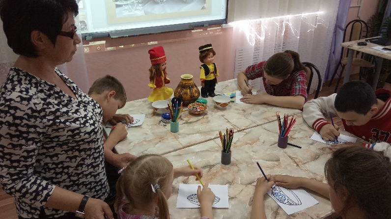Дәрес барышында балалар савыт-саба турында табышмаклар чиштеләр, аннан соң кәсә ясадылар, шуның белән үзләренең рәсемнәрендә татар декоратив-гамәли сәнгатенә мөнәсәбәтен белдерделәр.