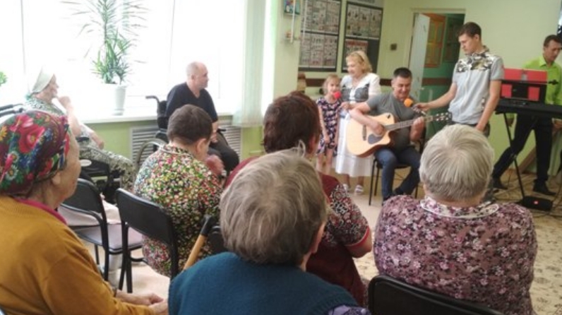 Данилов Сергей кызы Настя белән һәм социаль хезмәт алучы Лезина Л.П., Сергей һәм Надежда Ершовлар А. Пахмутова һәм Н. Добронавов җырлары белән чыгыш ясадылар.