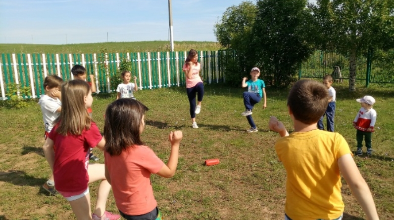 Балалар иртәнге гимнастикага чакыра торган күңелле тавышлар астында җыелалар.