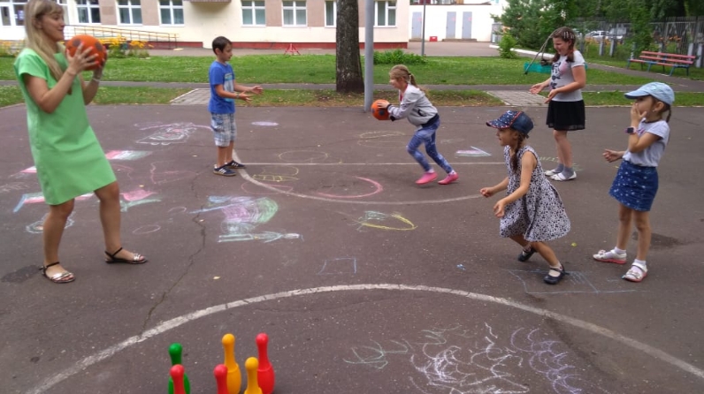 Төркемле дәрес мускулларны ныгыту өчен күнегүләр белән башланды. Уенчылар ике командага бүленделәр һәм бер-берсенә кара каршы бастылар. Аннары төркем капитаны тупны беренче вәкиленә ыргытты, ә тупны тотучы аны кире кайтарды һәм үзе капитан урынына басты. Уен бер команда җиңгәнчегә хәтле дәвам итте. Һәр катнашучы команда капитаны урынына басып карады. Алга таба биремне катлауландырдылар, моториканы үстерү күнегүенә кеглялар белән күнегүләр өстәде. Командаларда катнашучылар тупны тоткач, кегляләр арасыннан йөгерергә тиеш булдылар. Шулай итеп, балалар хәрәкәт эшчәнлеген һәм балаларның коммуникатив күнекмәләрен үстерделәр.