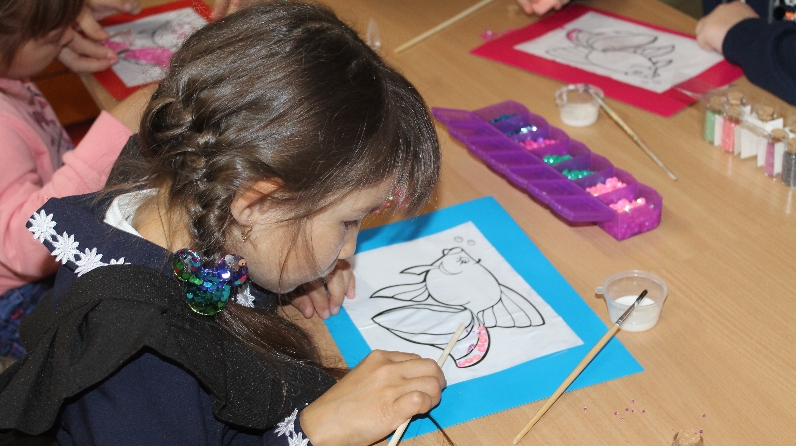 Балаларга, төрле материаллар кулланып, күләмле аппликация булдырсын өчен әзер балык трафаретларын сайларга тәкъдим ителде. Барысы да кечкенә генә шедеврлары булдыру буенча иҗади процесска бик теләп кушылды.