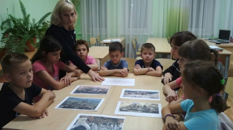 Дәрес барышында балалар Севастополь шәһәренең барлыкка килү тарихы белән таныштылар, ул 1853-1856 еллардагы Кырым сугышы вакытында Кара диңгез флоты диңгезчеләре буларак танылган, шәһәр халкы Севастопольне саклауга оешкан төстә басты.