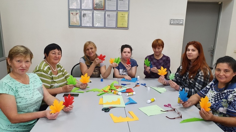 Хезмәт буенча инструктор оригами техникасын кулланып кәгазьдән өрәңге яфракларын ясау тәртибен аңлатты һәм күрсәтте. Социаль хезмәт алучылар үзара аралашып, җылы атмосферада рухи байлык алып, артстудия бүлмәсен бизәү өчен төрле төстәге өрәңге яфраклары ясадылар. Үз куллары белән ясалган төрле төстәге өрәнге яфраклары һәм оригами техникасы буенча оештырылган шөгыль катнашучыларның кәефләрен яхшыртырга һәм күңел күтәренкелеген тоярга ярдәм итте.