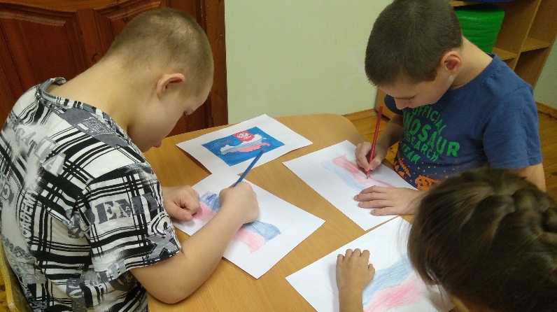 Балалар белән без Россия әләмен ясадык. Рәсем ясаган вакытта мин аларга флагның нинди төстә булуы, һәр төснең әһәмияте турында сөйләдем. Ахырда Мин аларга Россия гимнын керттем. Балалар зур кызыксыну белән тыңладылар. Эшне зур кызыксыну белән башкардык. Эштән бик күп уңай эмоцияләр алдык.