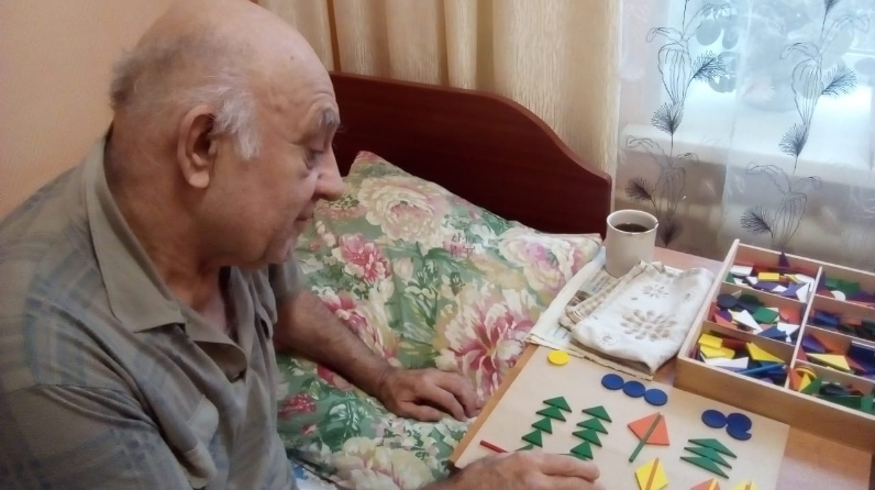 Җәлил картлар һәм инвалидлар йортында «Геометрик мозаика» дигән темага шәхси һәм төркем белән дәресләр үткәрелә. Физик мөмкинлекләре чикләнгән өлкәннәр Демидова З.Р. белән берлектә геометрик фигуралардан мозаик панно ясадылар: чәчәкләр, йортлар, хайваннар, кошлар һ. б. Мондый дәресләр кешеләрнең гомуми эш сәләтен арттыруга, психик киеренкелекне бетерүгә, эшчәнлекнең бер төреннән икенчесенә җиңелчә күчүгә ярдәм итә. Дәреснең башында геометрик предметлардан мозаика конструкциясе үткәрелә, соңыннан аппликация техникасы ярдәме белән геометрик фигуралар ясала.