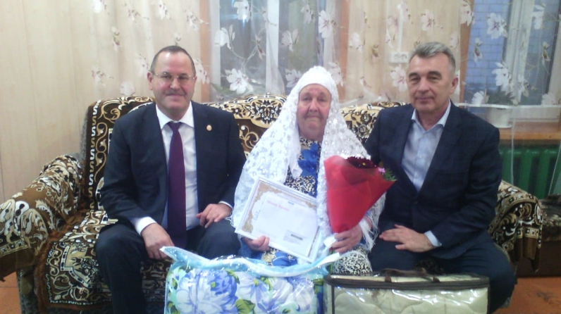 Юбилярга Россия Федерациясе Президенты Владимир Путинның котлау открыткасын, Балтач муниципаль район башлыгы исеменнән Рәхмәт хаты һәм кыйммәтле бүләк, соңгы эш урыны һәм авыл җирлеге исеменнән бүләкләр тапшырдылар.