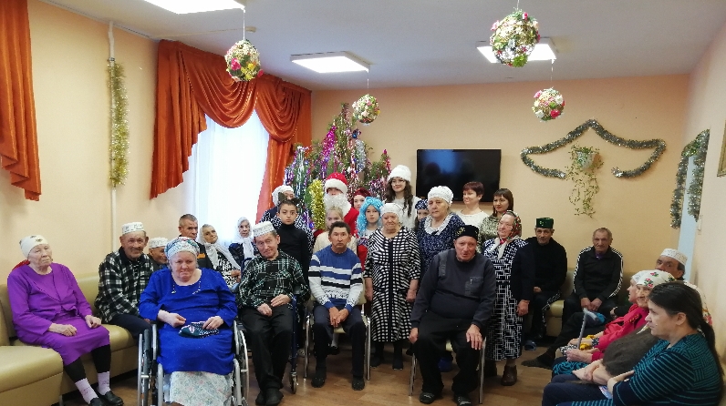Бәйрәм Яңа ел музыкаль котлаулары белән һәм иң изге теләкләр белән, сәламәтлек, иминлек, уңышлар һәм яхшы кәеф теләп башланды. Социаль хезмәт алучыларны якынлашып килүче Яңа ел белән Крым-Сарай авыл җирлеге башлыгы Шакирҗанов Д. А., интернат-йорт директоры Калимуллина Т. В., Баулы шәһәренең 5нче мәктәбе укучылары: «Благодарение» хәйрия фонды ярдәме белән волонтерлар отряды һәм Яшь армиячеләр отряды котлады. Кунаклар биредә яшәүчеләргә Яңа ел бүләкләре тапшырдылар.