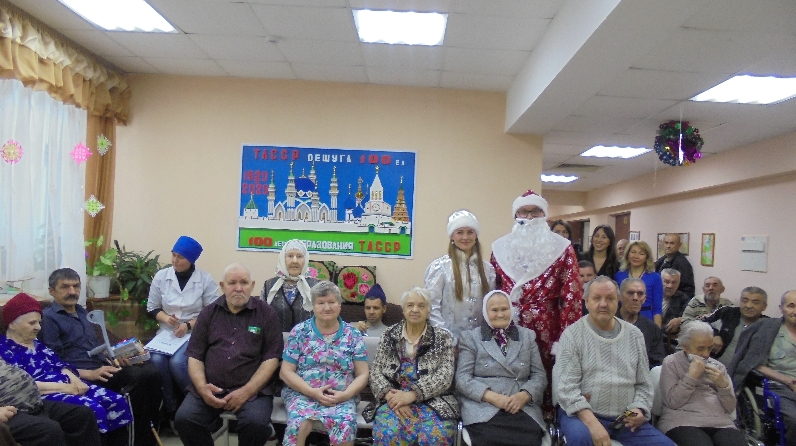 Тукай районы өлкәннәр һәм инвалидлар өчен интернат-йортында социаль хезмәт алучыларны әлеге бәйрәм белән котларга Яр Чаллы шәһәреннән «Альфа» һәм «Дэлко» оешмаларыннан волонтерлар килгән иде. Алар интернат-йортта яшәүчеләрне ихлас күңелдән котладылар, аларга сәламәтлек, оптимизм, озын гомер теләделәр . Кунаклар буш кул белән түгел, ә Яңа ел күчтәнәчләре белән килгән. Чарада катнашучылар бу очрашудан бик кәнагәть калдылар.