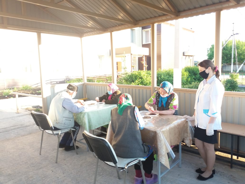 Бүген без картлар һәм инвалидлар интернат-йортында социаль хезмәт алучылар белән (саф һавада 2-3 кеше җыелып) ярма чүпләү буенча шәхси шөгыль үткәрдек.