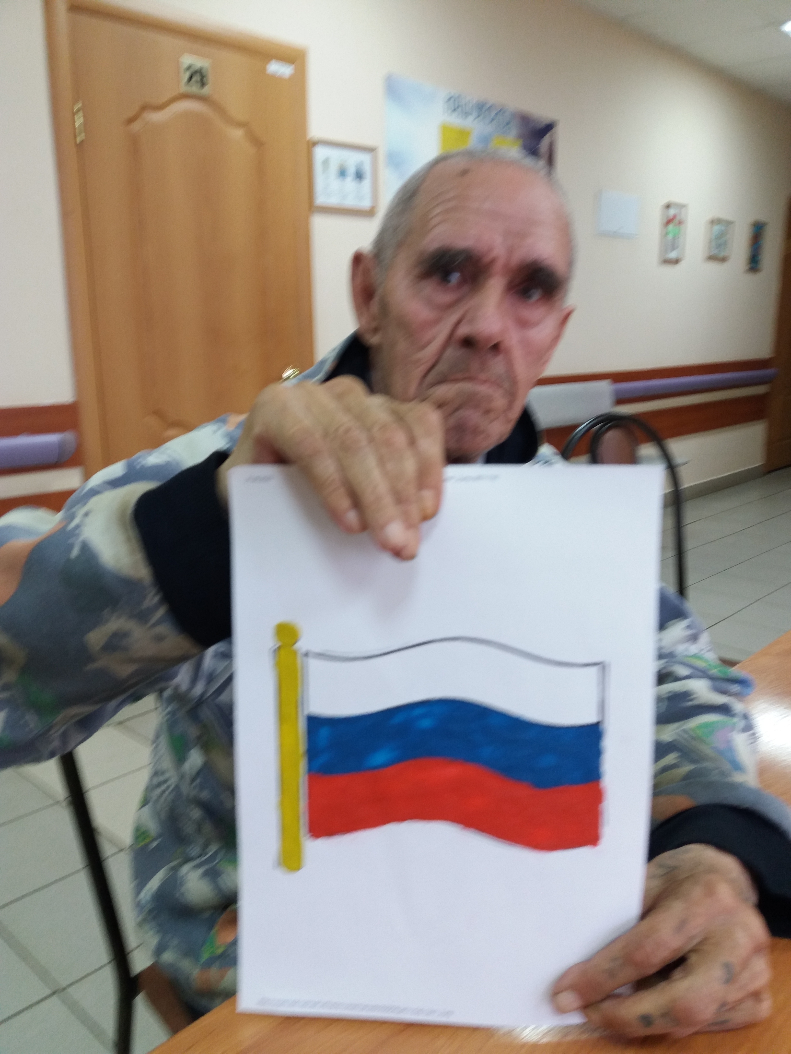 Бүген - Россия флагы көне. Россия Федерациясе Дәүләт флагы көне - үзен күпмилләтле бөек дәүләтнең чын гражданины итеп таныган, аның көчле ил булып мул тормышта яшәвен теләгән һәр кеше өчен олы бәйрәм. Россия флагының өч төсе - Ватаныбызның иң мөһим символларының берсе. Ак төс азатлык һәм мөстәкыйльлек, зәңгәр - ышаныч һәм рухият, кызыл бөеклек һәм көч-куәт дигәнне аңлата. Без интернат-йортында яшәүчеләр өчен мавыктыргыч чара үткәрергә булдык. Бурыч түбәндәгечә иде: ирекле, уен формасында РФ символикасы белән танышу. Моның өчен Россия Федерациясе флагын буяу яхшы туры килә. Бу бит туган илгә мәхәббәт һәм патриотизм хисе тәрбияләү өчен менә дигән кулланма. Яшәүчеләрнең һәркайсы РФ әләмен бизәүнең үз ысулын сайлады. Кемдер төсле карандашлар һәм фломастерлардан файдаланды; кемдер пластилин белән кулланды.Чара өлкәннәребезгә бик ошады.