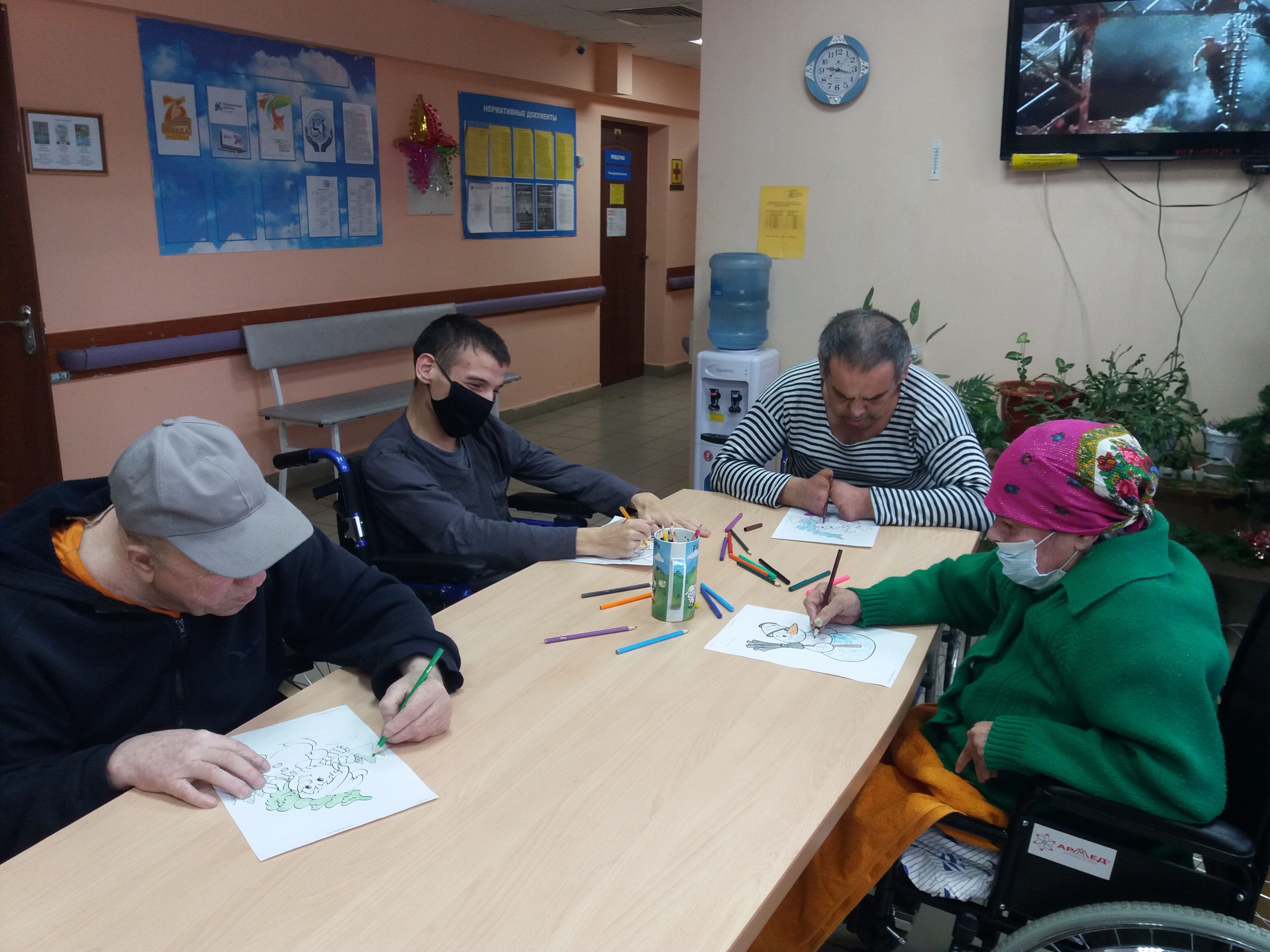 20.01.2021 ел, чәршәмбе.Бүген без картлар һәм инвалидлар интернат-йортында социаль хезмәт алучылар белән «Бергәләп ясыйк!» дигән шәхси шөгыль үткәрдек. Һәркем үзенең күңеле яткан рәсемне сайлап алды һәм аны үз кәефенә туры китереп буяп чыкты. Барлык рәсемнәрне җыйгач, искиткеч матур күргәзмә килеп чыкты.
