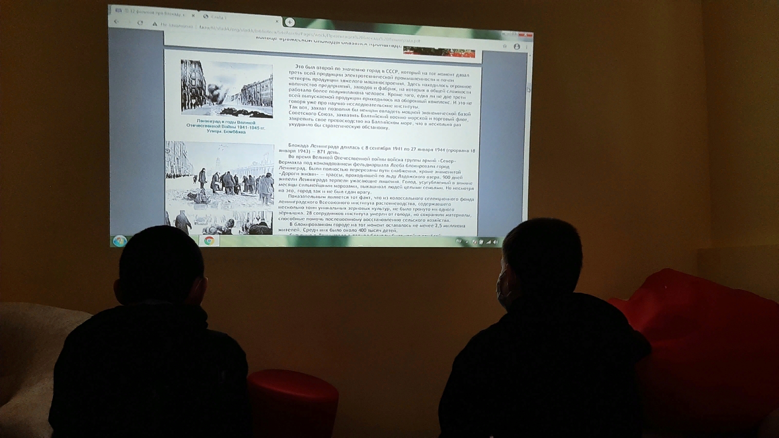 Дәрес барышында балалар ленинградлыларның туган шәһәрләрен дошманга бирмәс өчен көрәшүләре турында мәгълүмат алдылар. Куркыныч сынауларга карамастан камалыш вакытында шәһәрдә заводлар, фабрикалар, музейлар эшли, эстрада театры һәм ленинград радиосы үз эшчәнлеген туктатмый.