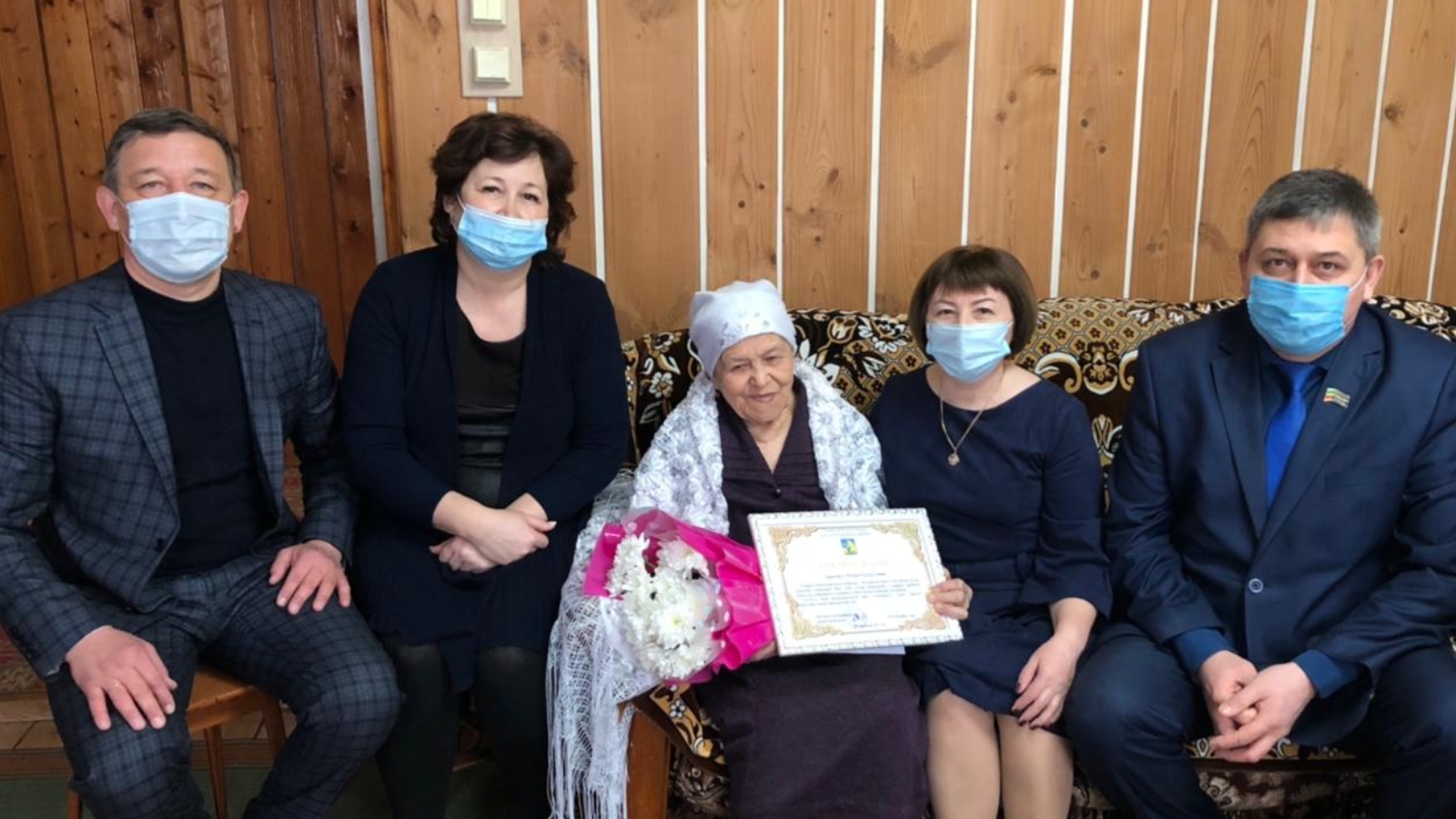 Юбилярга Россия Федерациясе Президенты Владимир Путинның котлау открыткасын, Балтач муниципаль район башлыгы исеменнән Рәхмәт хаты һәм кыйммәтле бүләк, архив бүлеге һәм Балтач шәһәр җирлеге исеменнән бүләкләр тапшырдылар.