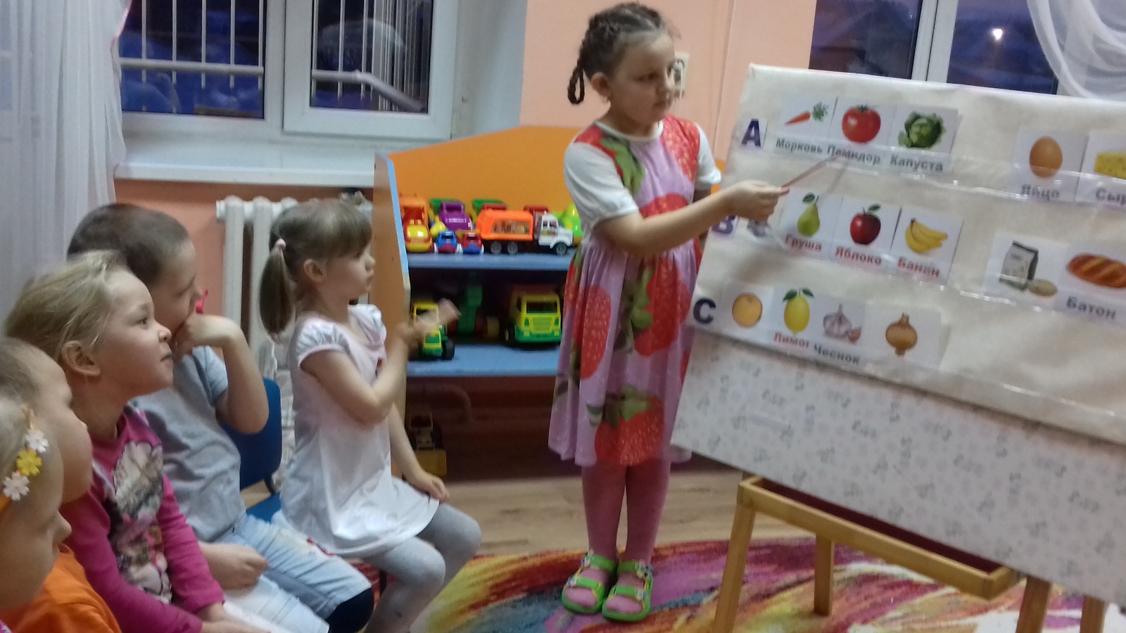 Дәрес вакытында мәктәпкәчә яшьтәге балалар, алар өчен уңайлы уен формасында, витаминнар, аларның кеше сәламәтлеге өчен файдасы турында белделәр. Балалар яшелчә һәм җиләк-җимеш турында табышмаклар чиштеләр, файдалы продуктлар турында кызыксынып, рәсемнәр карадылар. Балалар рәхәтләнеп “Яшелчә һәм җиләк-җимешләрне кәрзиннәргә таратып сал” уенын уйнадылар, шул вакытта үзләренең җитезлекләрен, игътибарларын һәм хәтерләрен күрсәттеләр.