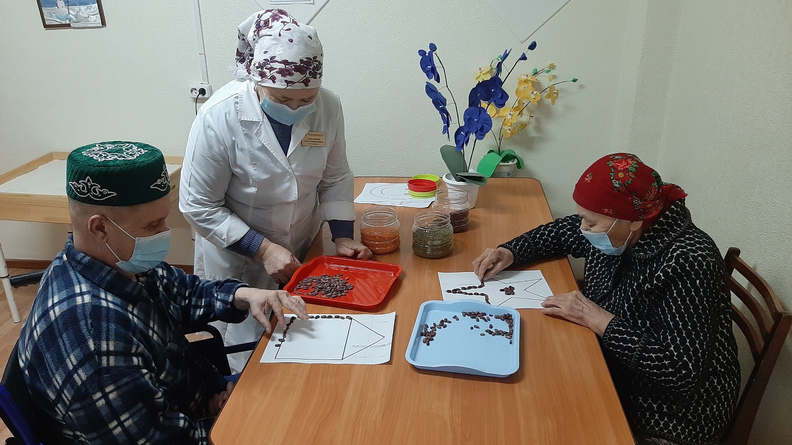 Мөслим картлар һәм инвалидлар интернат-йортында социаль хезмәтләрдән файдаланучылар өчен озак вакытлы карау системасын кертү буенча актив эш алып барыла. Учреждение белгечләре һәм медицина персоналы көче белән өлкән яшьтәге кешеләзрнең сәламәтлеген торгызу, ныгыту буенча чаралар үткәрелә. «Ярма терапиясы» технологиясе буенча шөгылләнгәндә безнең әби, бабайлар төрле ярмалар белән эшлиләр, кинетик сизгерлекне һәм кул чугының вак моторикасын торгызуга, мускул киеренкелеген бетерүдә үзгәрешләр сизелә. «Ярма терапиясы» технологиясе организмның тормыш эшчәнлеге бозылган процессларны нормальләштерүгә юнәлдерелгән. Ярмаларның күп төрлелеге, зурлыгы, формасы, төсе, куелган бурычларга карап төрле вариантларда кулланырга мөмкинлек бирә. Безнең интернат-йорт карамагындагы әлкәннәр ярмалар белән рәсемнәр, бармакларга массаж ясарга яраталар.