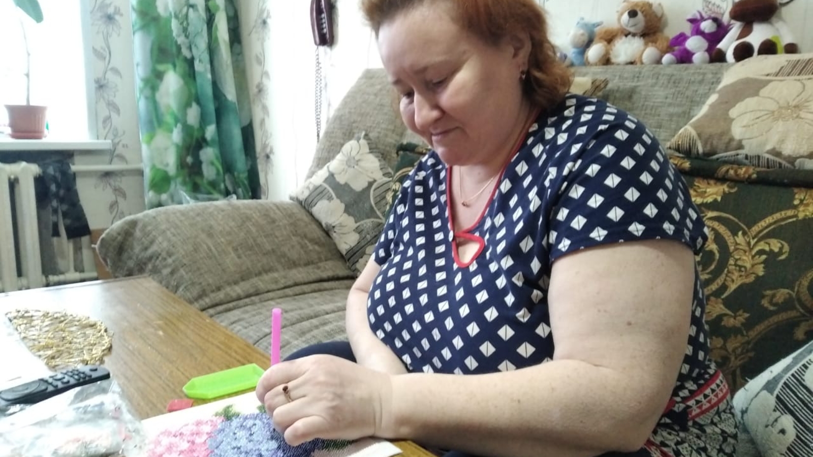 Технология бик мавыктыргыч һәм җиңел. Стразалар тезү процессы барышында белгеч алмаз чигүнең килеп чыгу тарихы һәм аның төрләре турында сөйләде. Социаль хезмәт алучының өлешчә вак моторикасы бозылган, шуңа күрә ул үз эшенең уңышлы нәтиҗәсенә шаккатты. Әзер картинаны ул иң күренеп торган урынга элеп куйды.