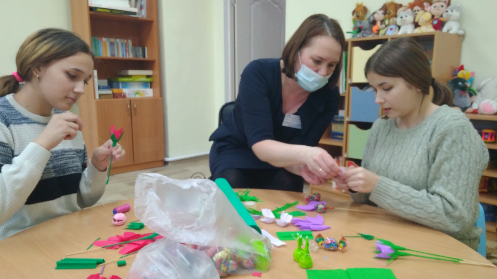 8 март Халыкара көн алдыннан «Радуга» комплекслы үзәгендә социаль эшләр буенча белгеч Елена Крутякова һәм психолог Галина Артеполихина “Бумагапластика” технологиясен кулланып, бүлекчәнең социаль хезмәтләр балигъ булмаган алучылары белән мастер класс үткәрделәр. Чара иҗади сәләтләрне үстерүгә һәм катнашучыларның эмоциональ киеренкелеген бетерүгә юнәлтелгән иде. Яшүсмерләргә конфеттан һәм гофрирланган кәгазьдән чәчәкләр бәйләме ясарга тәкъдим иттеләр, аларны алар аннары үз әниләренә, әбиләренә бүләк итәчәкләр. Эш барышында балалар үзара актив аралаштылар, төрү кәгазе кулланып бүләкләрне матур итеп рәсмиләштерергә өйрәнделәр. Катнашучылар алган әйберләрдән сокланып калдылар, букетика матур һәм нәфис килеп чыкты.