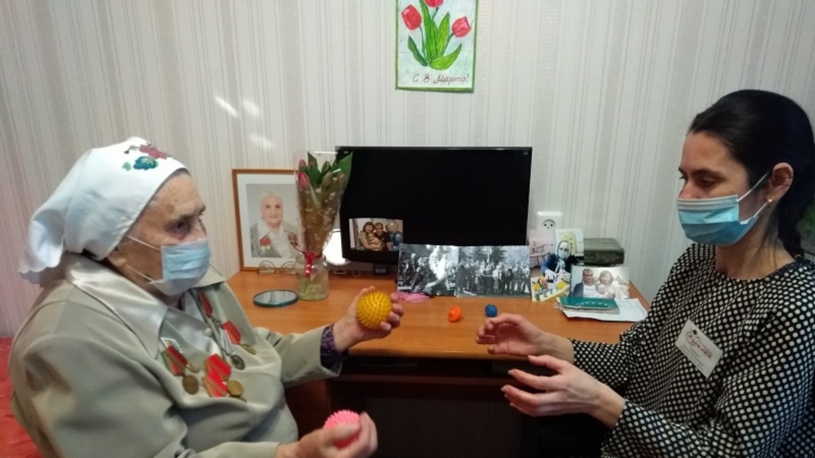 “Изгелек” инвалидларны тернәкләндерү үзәгенең волонтерлары-социаль эш буенча белгечләр Рәмзия Хәйбулова һәм Мәдинә Хажарова 94 яшьлек тыл ветераны, сугыш ветеранының тол хатыны Саимә Гарипованың өендә булдылар.