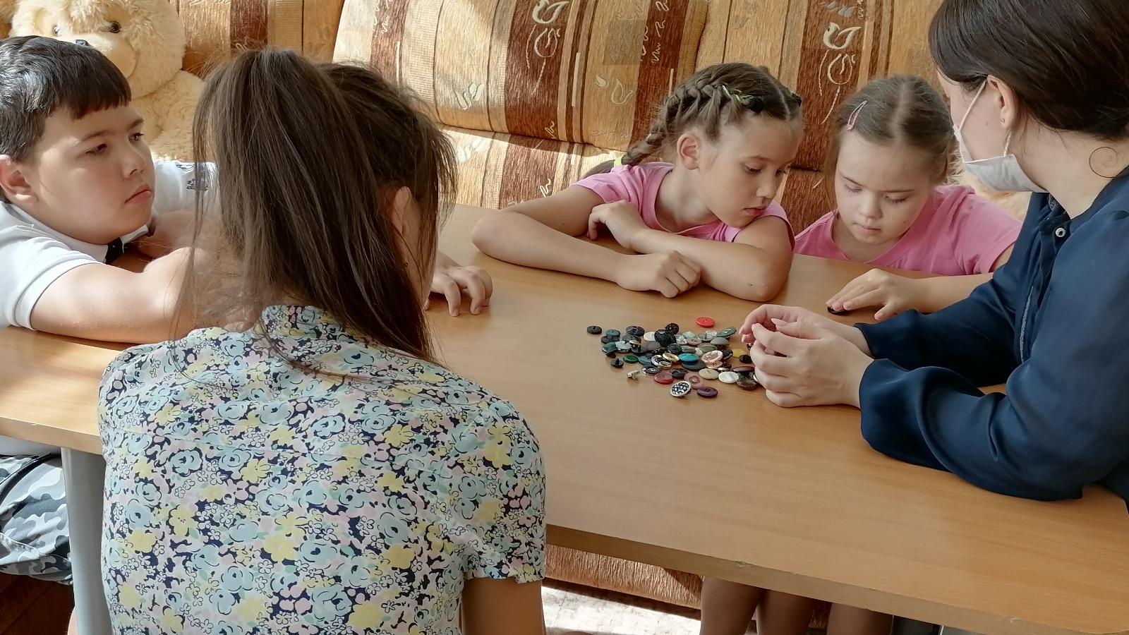 Алга таба бердәм эшләп үзара мөнәсәбәтләрне җайга салу өчен психолог дәрес башында «Үрдәк назлый» күнегүен үткәрде. «Сәдәфле массаж» күнегүләре балаларга вак моторика үсешенә, форма, зурлык һәм пространство юнәлешләре белән танышырга ярдәм итте. Катнашучылар кулларына бер төймә алып аның нинди икәнен: сузылган, квадрат, шома икәнен карадылар, аны учлар арасында тотып карадылар, төймәләр өслеге буенча бармаклары белән йөрттеләр, сәдәф турында сөйләделәр, хис-тойгыларын тасвирладылар.