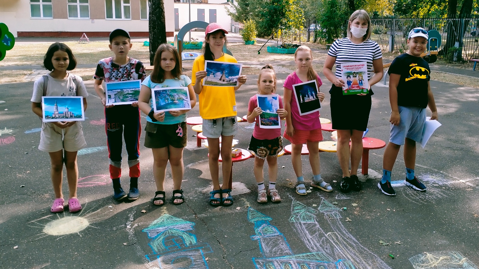Дәрес ахырында балалар асфальтта туган шәһәрнең истәлекле урыннары турында рәсем ясадылар.