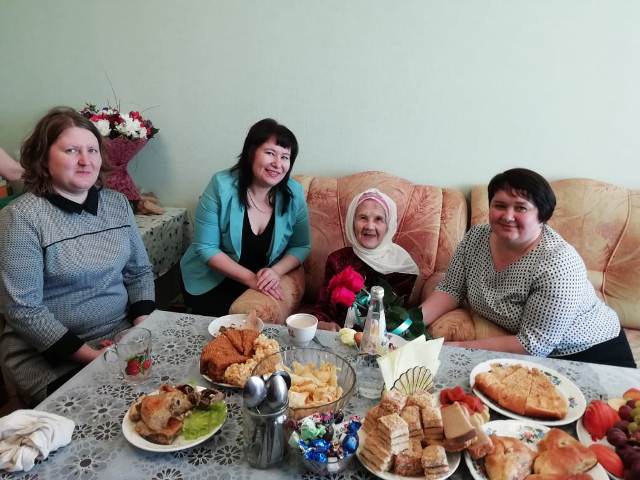 2019 елның 27 апрелендә директор вазыйфаларын башкаручы Сәләхиева З. З., өйдә социаль хезмәт күрсәтү бүлекчәсе мөдире Галимҗанова Л. О. Һәм социаль эшләр буенча белгеч Галимҗанова Г. Н. Бүлекчәдә карамакта торучы Хөснуллина Мөстәбширә Ибраһим кызында булдылар. Килүнең максаты әбине 90 яшьлек юбилее белән котлау иде. Мөстәбширә Ибраһим кызы тыл хезмәтчәне, моны аның сугыш елларындагы тугры хезмәте өчен бирелгән мактау грамоталары раслый. “Изгелек” үзәге хезмәткәрләре аңа истәлек бүләге тапшырдылар һәм матур теләкләрен җиткерделәр. Хөснуллина М. И. күрсәтелгән игътибар һәм кайгыртучанлыклары өчен зур рәхмәтен җиткерде.