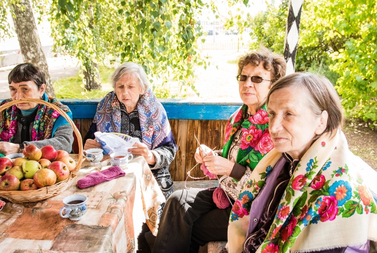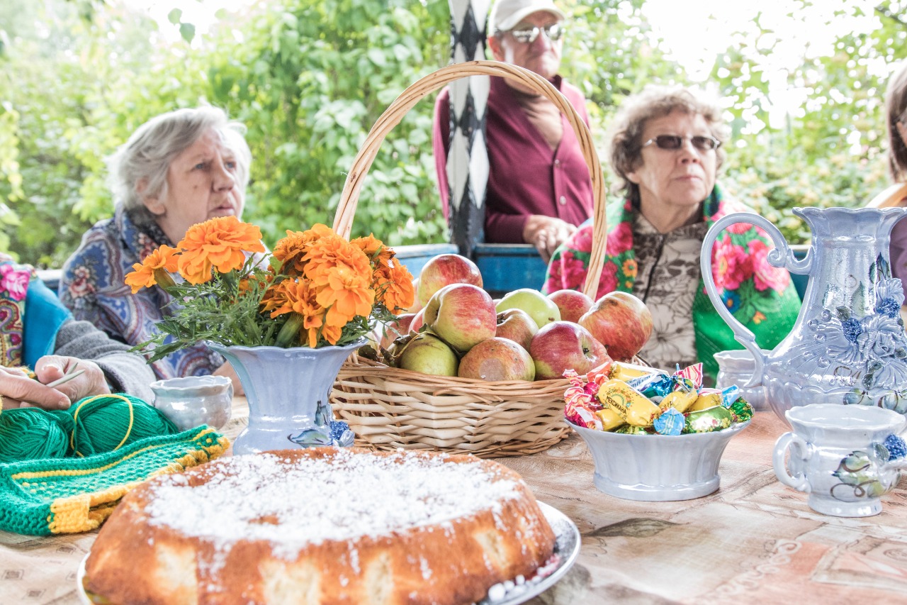 Чара ахырында, социаль хезмәт алучылар, бик теләп алмалы шарлотка һәм конфетлар белән чәй эчтеләр.