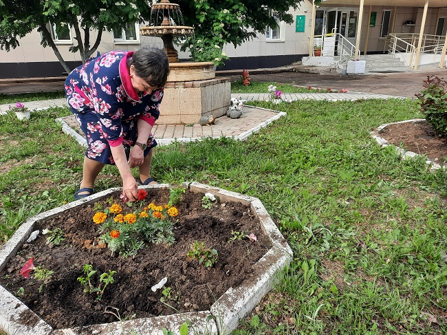 Өлкәннәр язгы-көзге сезонда интернат территориясендә хезмәт куя, шуңа да аларга күңелсезләнергә туры килми. Интернатта яшәүчеләр чәчәк түтәлләрен карарга булышалар, агач утырталар, интернат-йорт тирәсен тәртипкә китерәләр. "Хезмәт терапиясе"нең актив катнашучылары булып социаль хезмәт алучылар Николай Матвеевич Волков, Ирина Георгиевна Меховникова, Меркулов Георгий Степановичлар тора. Чөнки кеше хезмәте элек-электән хөрмәт һәм ихтирамга лаек булган. "Хезмәт терапиясе" технологиясе ярдәмендә авыру кешеләр нормаль тормышка кайта, физик хезмәт күнекмәләрен торгыза, борчу һәм киеренкелек хисеннән арына.